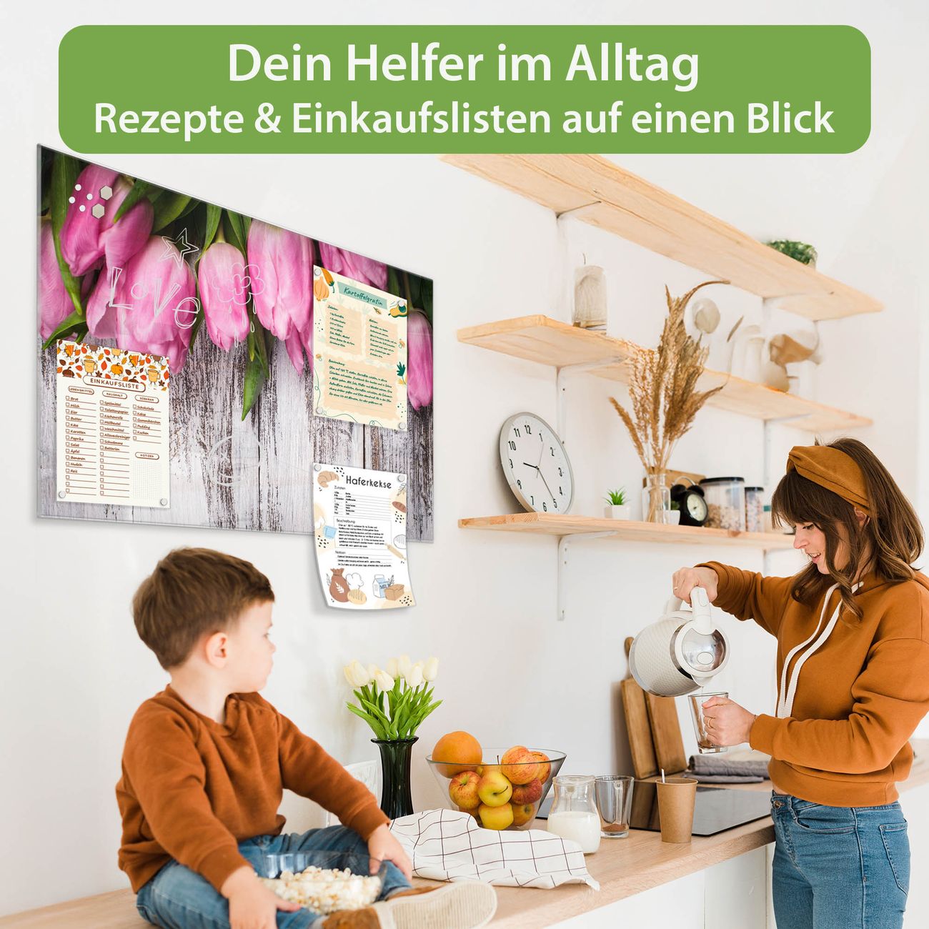 Ein Stück Design, das Ihren Alltag organisiert. Schreiben, heften, inspirieren - alles an einem Ort. Qualität, die man spürt. Montage leicht gemacht. Handwerk mit Herz - veredelt in Sachsen. Einzigartiges Design mit Motiv Motiv Holz und Tulpen Beschreibbare Glasoberfläche, leicht zu reinigen Starke Magnetkraft durch Stahlrückwand Inklusive 4 Neodym-Magneten Flexible Montageoptionen Handveredelt in Sachsen - Qualität, die bleibt