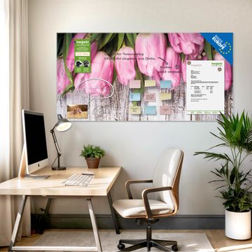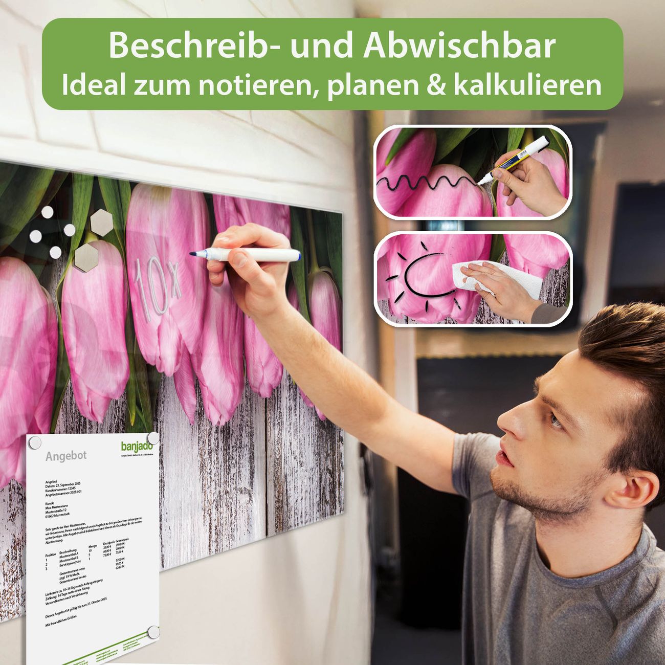 Die banjado Glas Magnettafel mit dem Motiv Motiv Holz und Tulpen verbindet Funktionalität mit Stil. Sie ersetzt das Zettelchaos durch klare Strukturen und bringt dabei eine warme, natürliche Atmosphäre in Ihr Zuhause. Ob im Büro, in der Küche oder im Eingangsbereich - dieses Design-Board zieht Blicke an und sorgt für Ordnung mit Charakter.