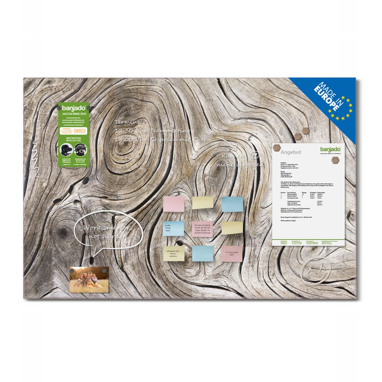 Jede Glas Magnettafel wird in unserer Werkstatt von Hand gefertigt und sorgfältig geprüft. So erhalten Sie ein echtes Qualitätsprodukt, das Funktion und Ästhetik perfekt vereint.?? Warum banjado?
