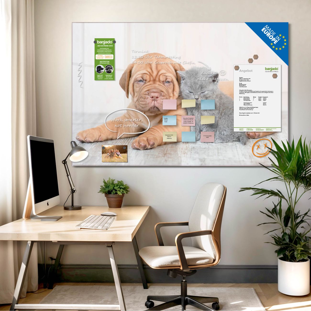 Jede Glas Magnettafel wird in unserer Werkstatt von Hand gefertigt und sorgfältig geprüft. So erhalten Sie ein echtes Qualitätsprodukt, das Funktion und Ästhetik perfekt vereint.?? Warum banjado?