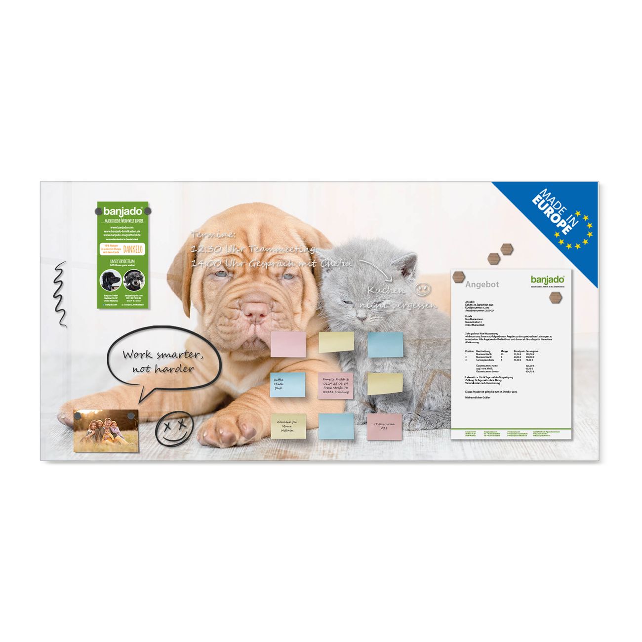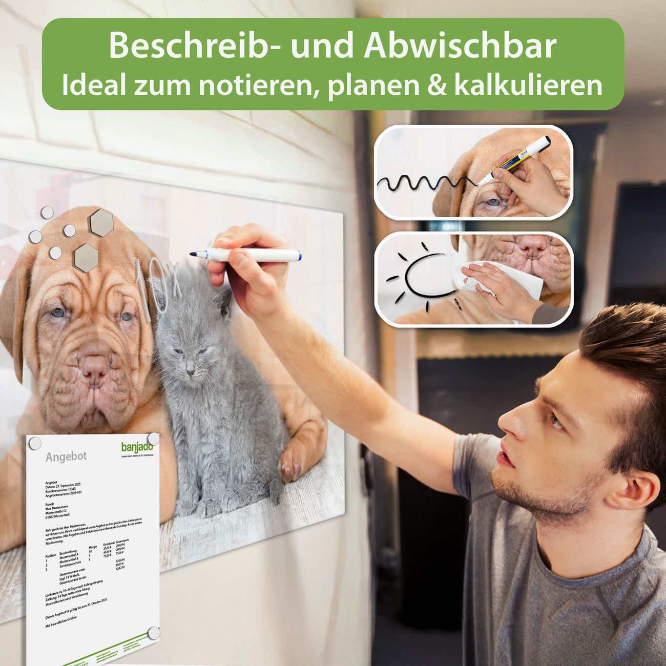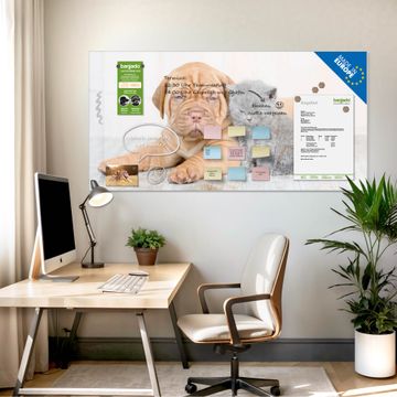 Die banjado Glas Magnettafel mit dem Motiv Motiv Hund und Katze verbindet Funktionalität mit Stil. Sie ersetzt das Zettelchaos durch klare Strukturen und bringt dabei eine warme, natürliche Atmosphäre in Ihr Zuhause. Ob im Büro, in der Küche oder im Eingangsbereich - dieses Design-Board zieht Blicke an und sorgt für Ordnung mit Charakter.