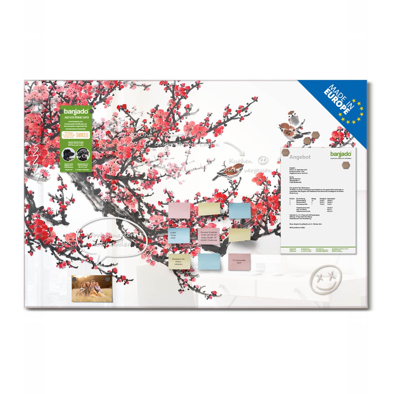 Ein Stück Design, das Ihren Alltag organisiert. Schreiben, heften, inspirieren - alles an einem Ort. Qualität, die man spürt. Montage leicht gemacht. Handwerk mit Herz - veredelt in Sachsen. Einzigartiges Design mit Motiv Motiv Japanische Blüten 1 Beschreibbare Glasoberfläche, leicht zu reinigen Starke Magnetkraft durch Stahlrückwand Inklusive 4 Neodym-Magneten Flexible Montageoptionen Handveredelt in Sachsen - Qualität, die bleibt