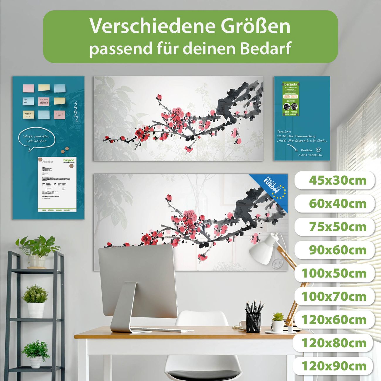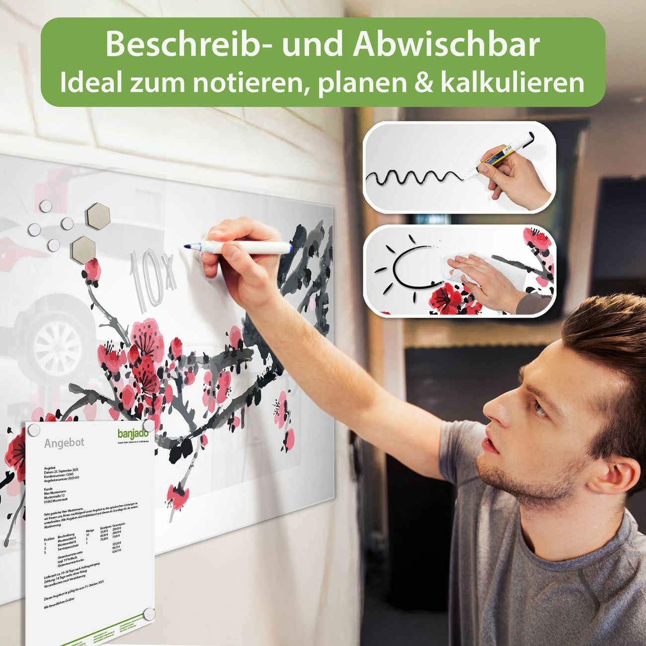 Die banjado Glas Magnettafel mit dem Motiv Motiv Japanische Blüten 2 verbindet Funktionalität mit Stil. Sie ersetzt das Zettelchaos durch klare Strukturen und bringt dabei eine warme, natürliche Atmosphäre in Ihr Zuhause. Ob im Büro, in der Küche oder im Eingangsbereich - dieses Design-Board zieht Blicke an und sorgt für Ordnung mit Charakter.
