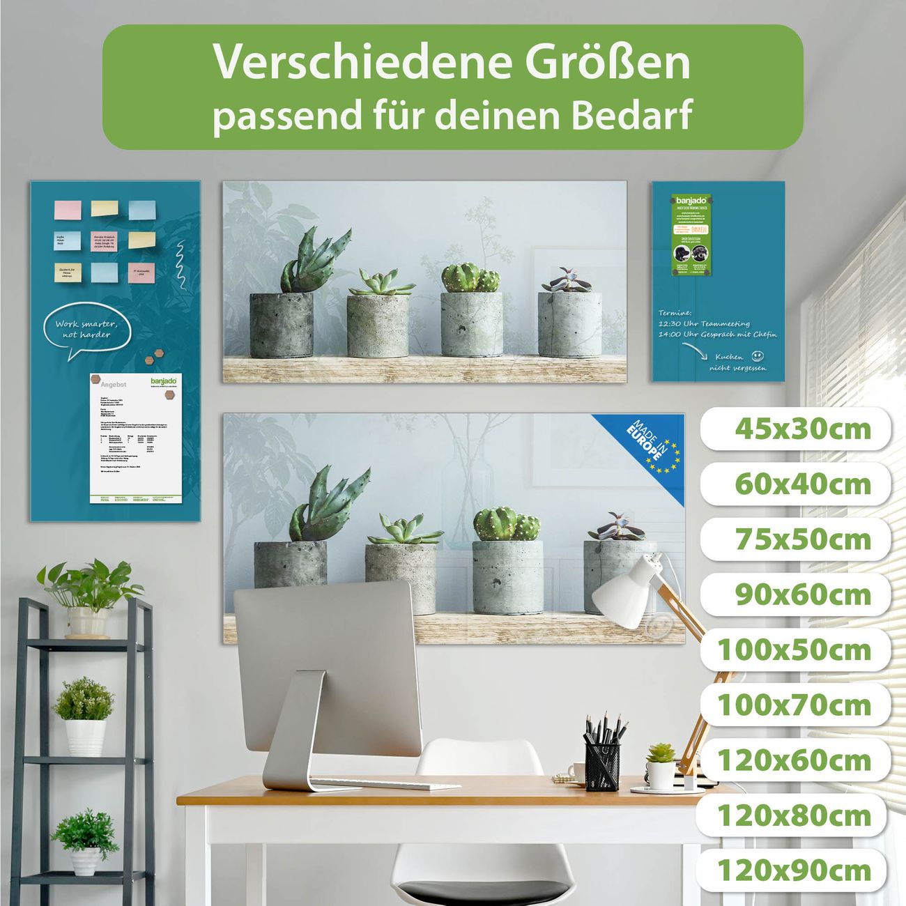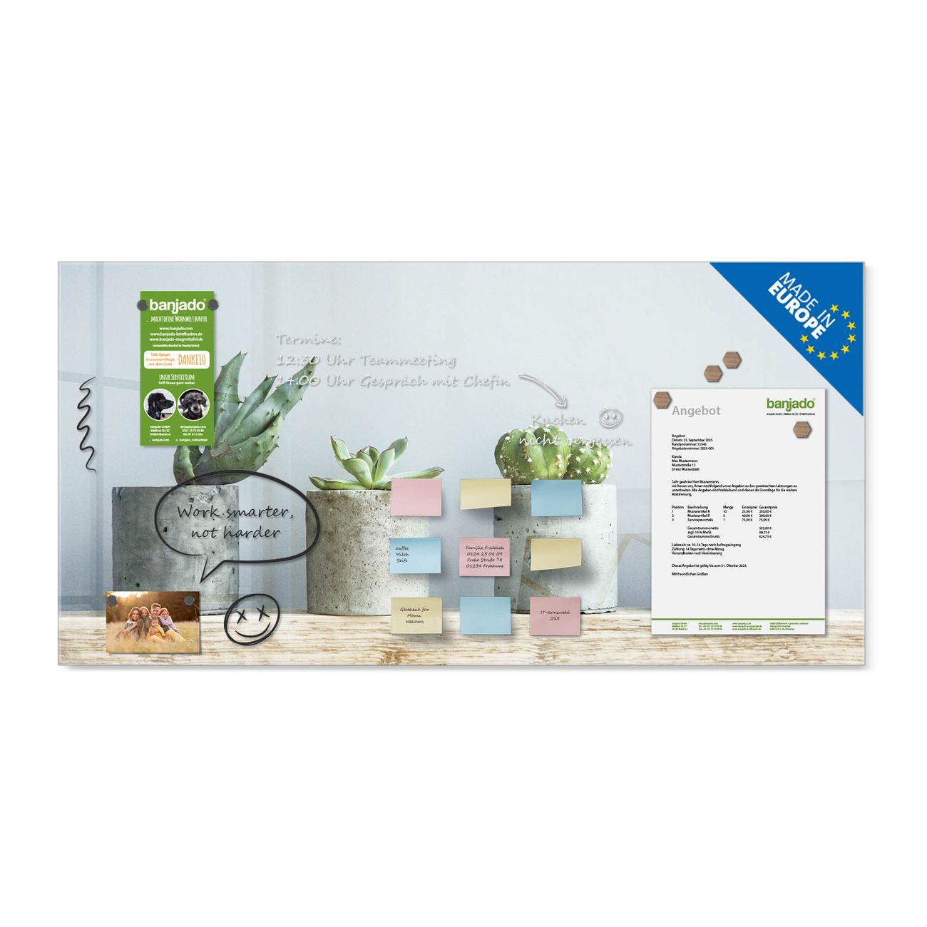 Jede Glas Magnettafel wird in unserer Werkstatt von Hand gefertigt und sorgfältig geprüft. So erhalten Sie ein echtes Qualitätsprodukt, das Funktion und Ästhetik perfekt vereint.?? Warum banjado?