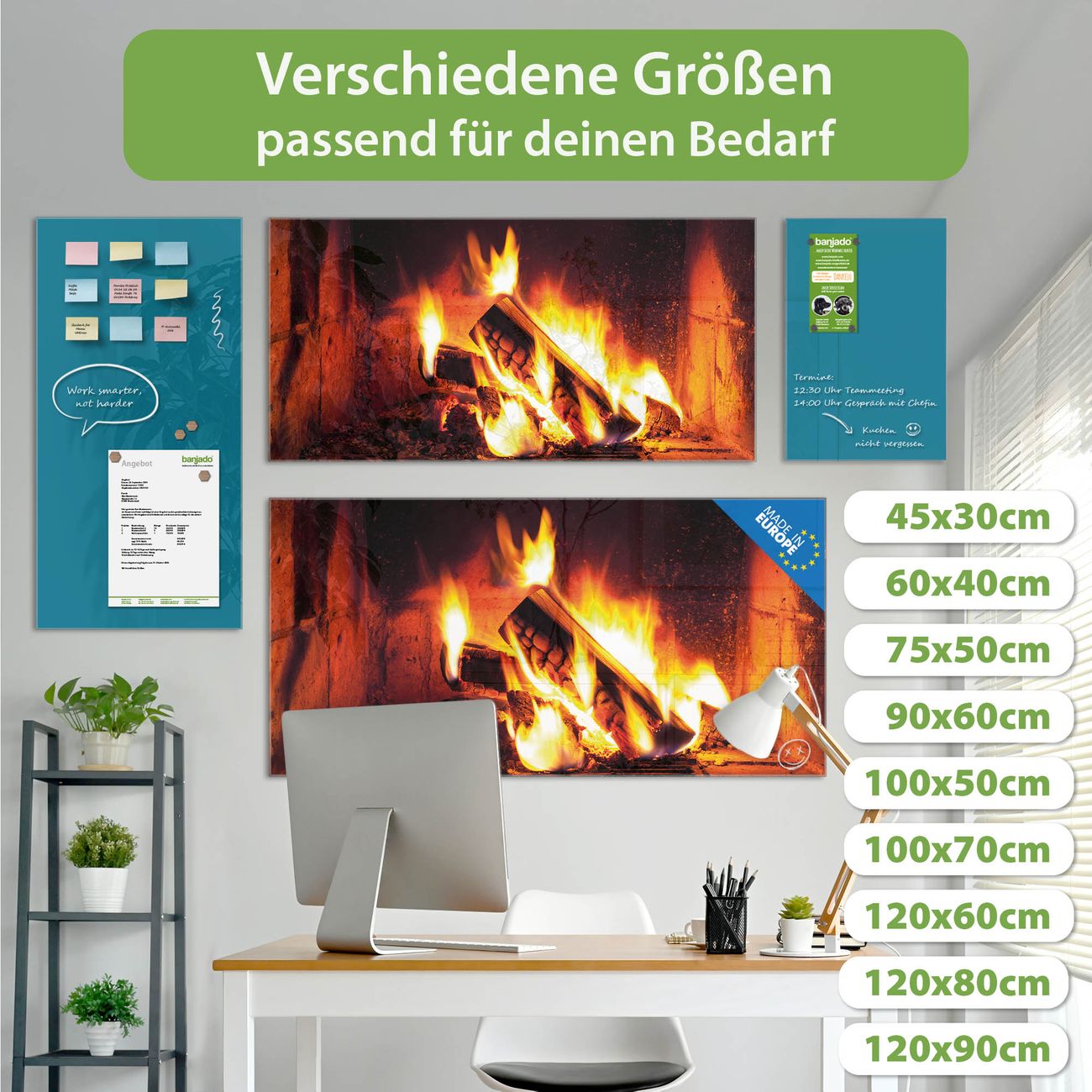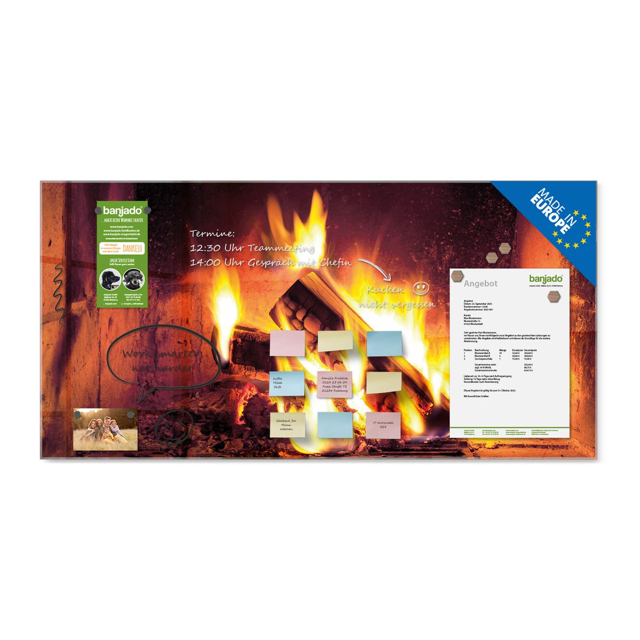 Ein Stück Design, das Ihren Alltag organisiert. Schreiben, heften, inspirieren - alles an einem Ort. Qualität, die man spürt. Montage leicht gemacht. Handwerk mit Herz - veredelt in Sachsen. Einzigartiges Design mit Motiv Motiv Kaminfeuer Beschreibbare Glasoberfläche, leicht zu reinigen Starke Magnetkraft durch Stahlrückwand Inklusive 4 Neodym-Magneten Flexible Montageoptionen Handveredelt in Sachsen - Qualität, die bleibt