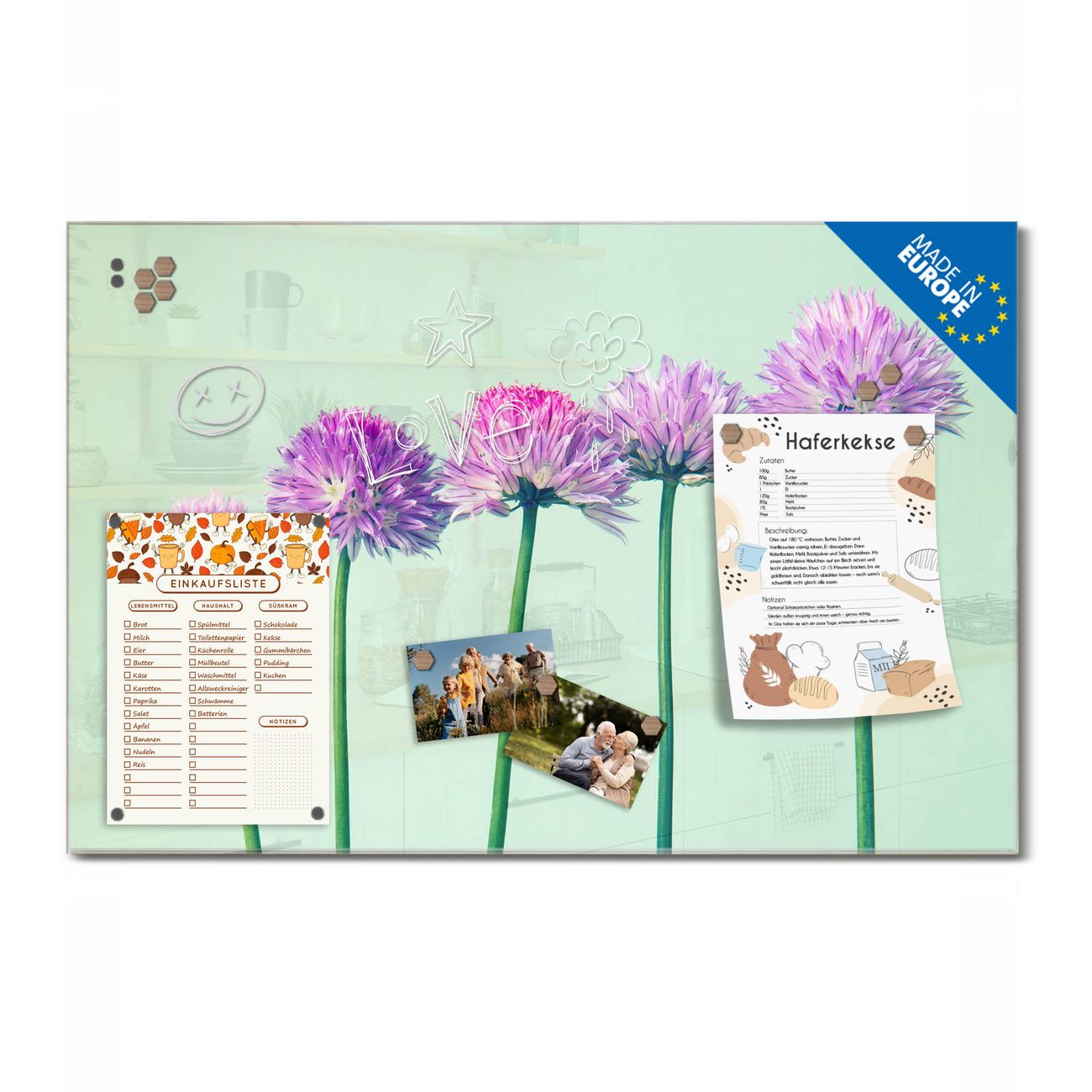Auf der glatten Glasoberfläche lassen sich Termine, Rezepte oder Notizen ganz einfach mit Kreidestiften festhalten und rückstandslos entfernen. Starke Neodym-Magnete halten Ihre wichtigsten Erinnerungen sicher an Ort und Stelle. So entsteht Ihre ganz persönliche Ideenwand - jeden Tag neu.