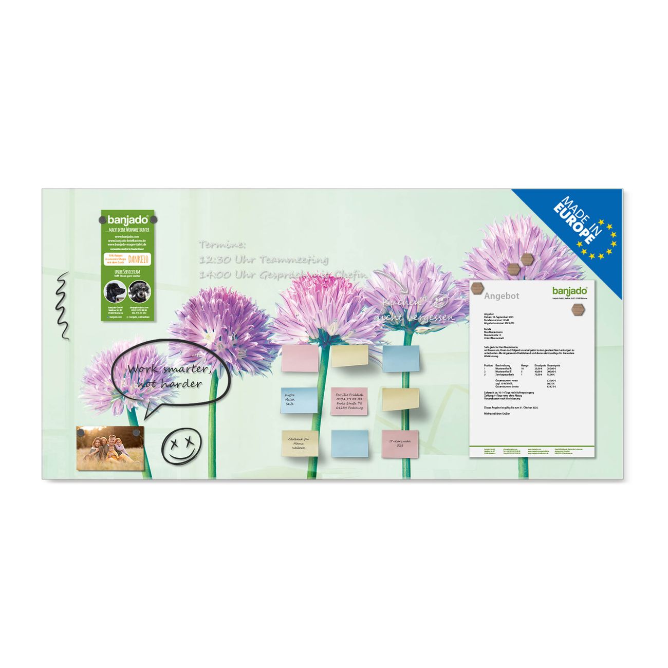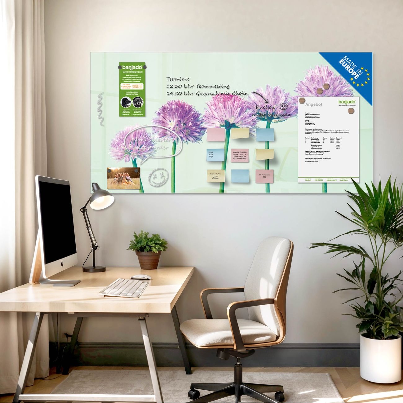 Jede Glas Magnettafel wird in unserer Werkstatt von Hand gefertigt und sorgfältig geprüft. So erhalten Sie ein echtes Qualitätsprodukt, das Funktion und Ästhetik perfekt vereint.?? Warum banjado?
