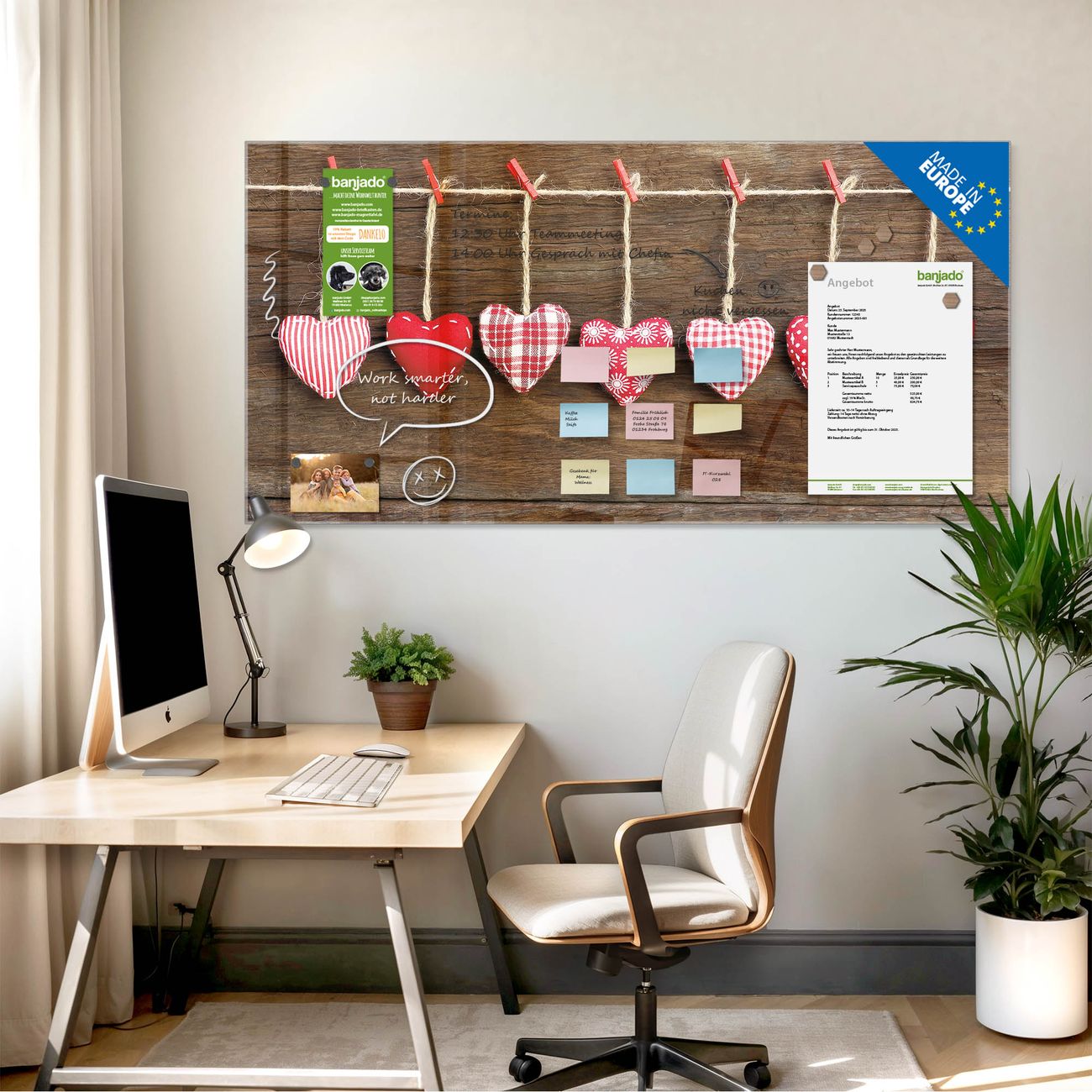 Jede Glas Magnettafel wird in unserer Werkstatt von Hand gefertigt und sorgfältig geprüft. So erhalten Sie ein echtes Qualitätsprodukt, das Funktion und Ästhetik perfekt vereint.?? Warum banjado?