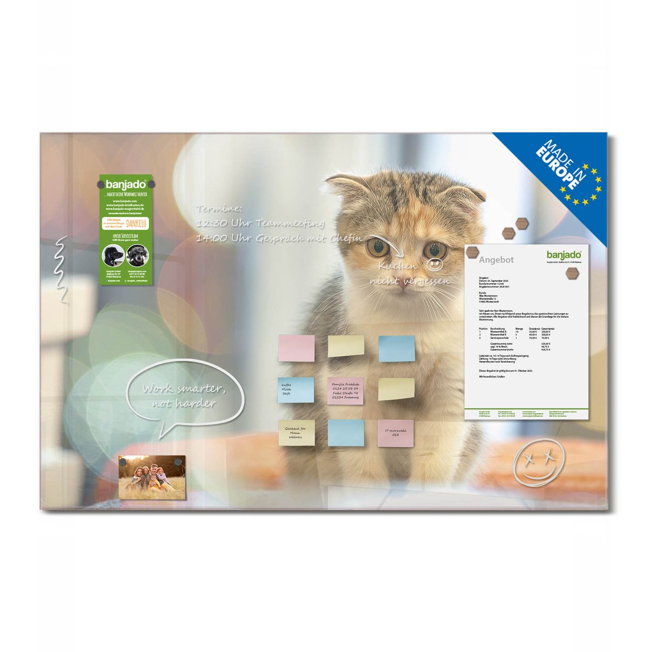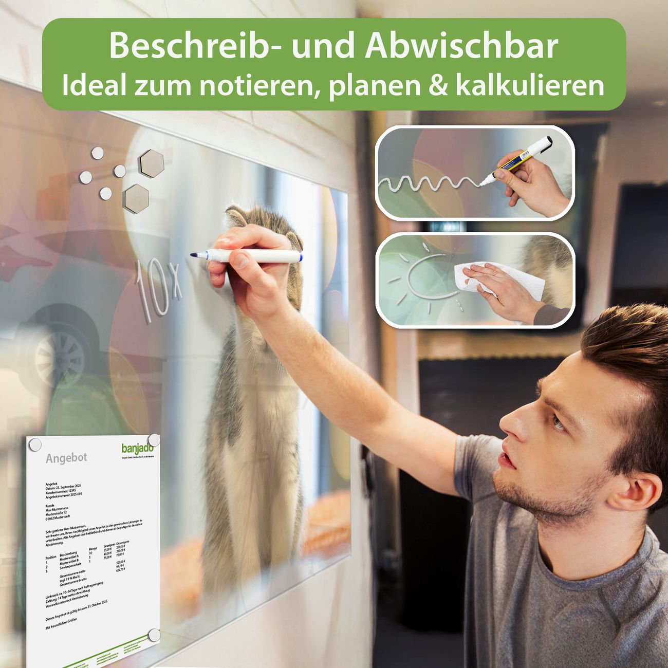 Jede Glas Magnettafel wird in unserer Werkstatt von Hand gefertigt und sorgfältig geprüft. So erhalten Sie ein echtes Qualitätsprodukt, das Funktion und Ästhetik perfekt vereint.?? Warum banjado?