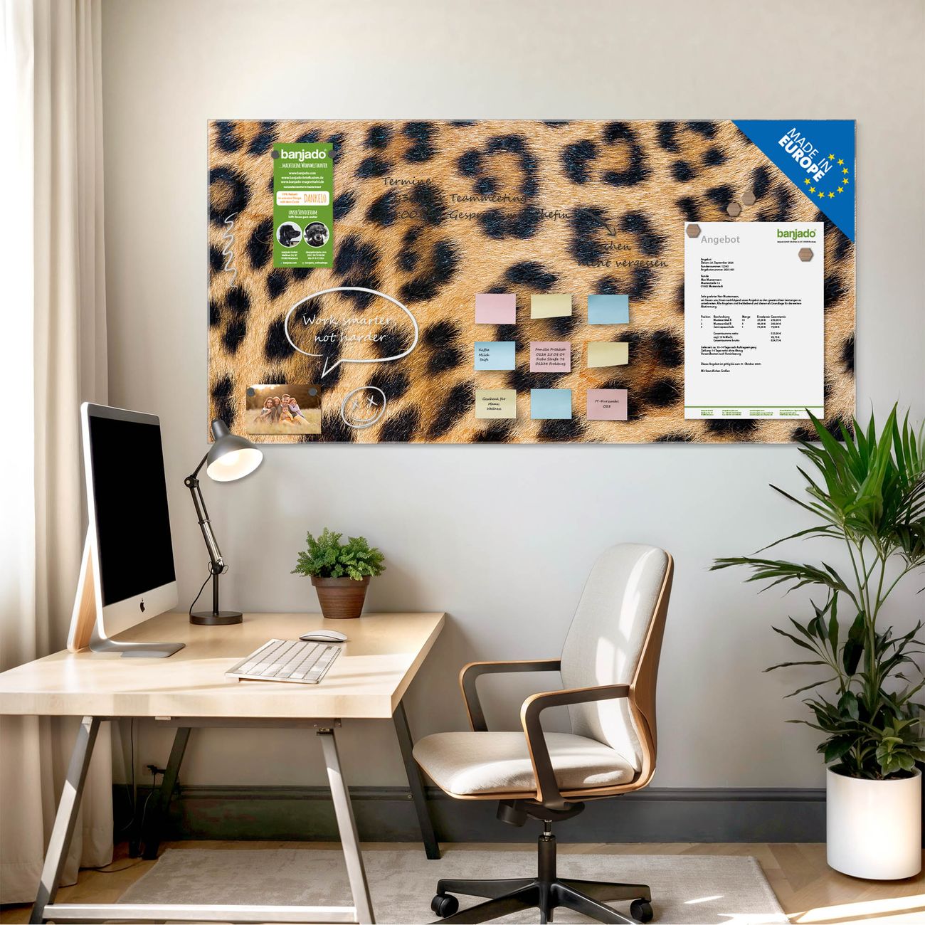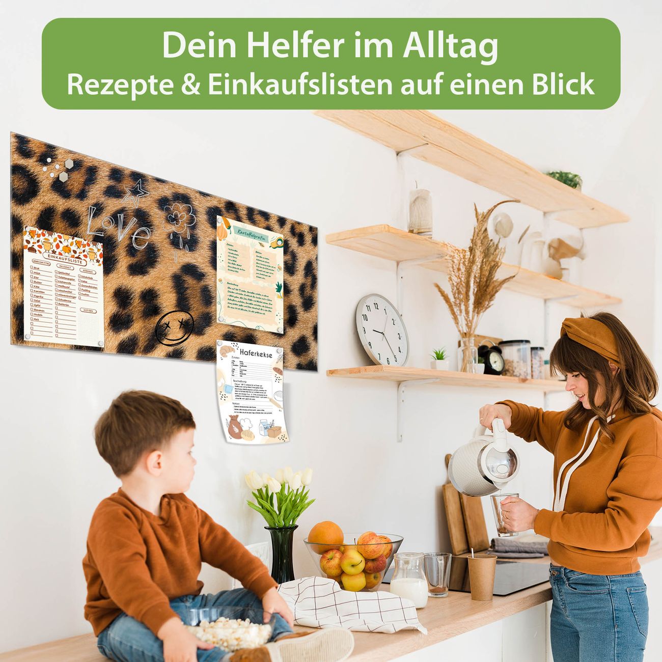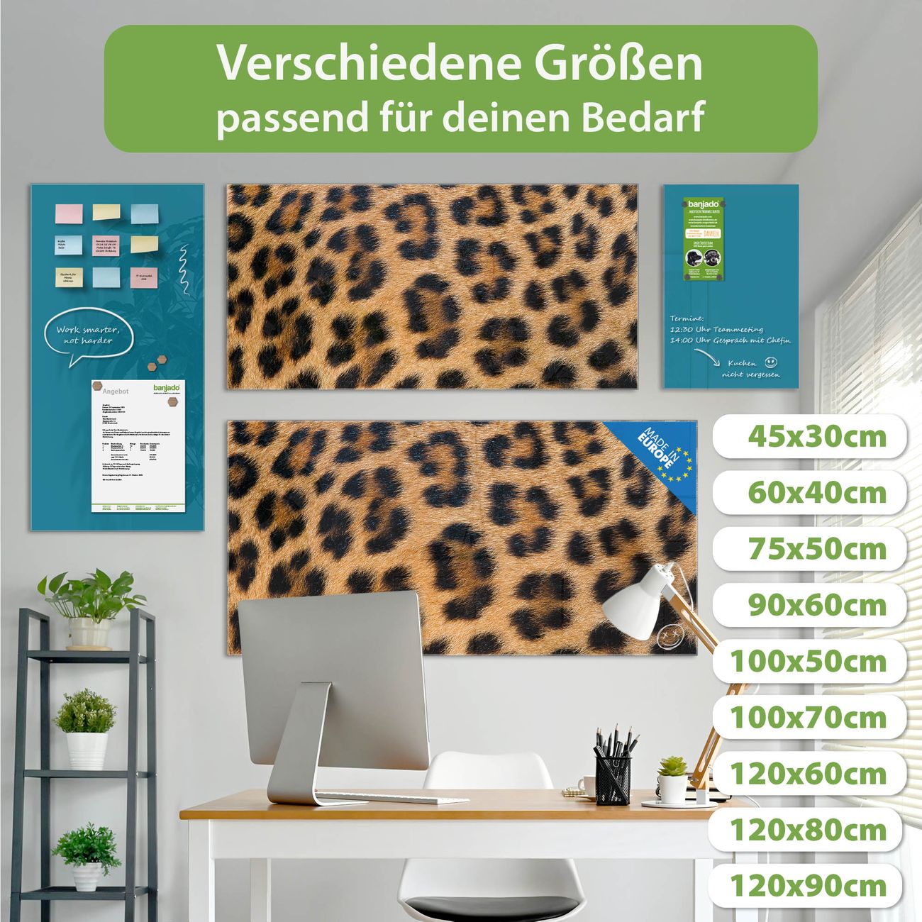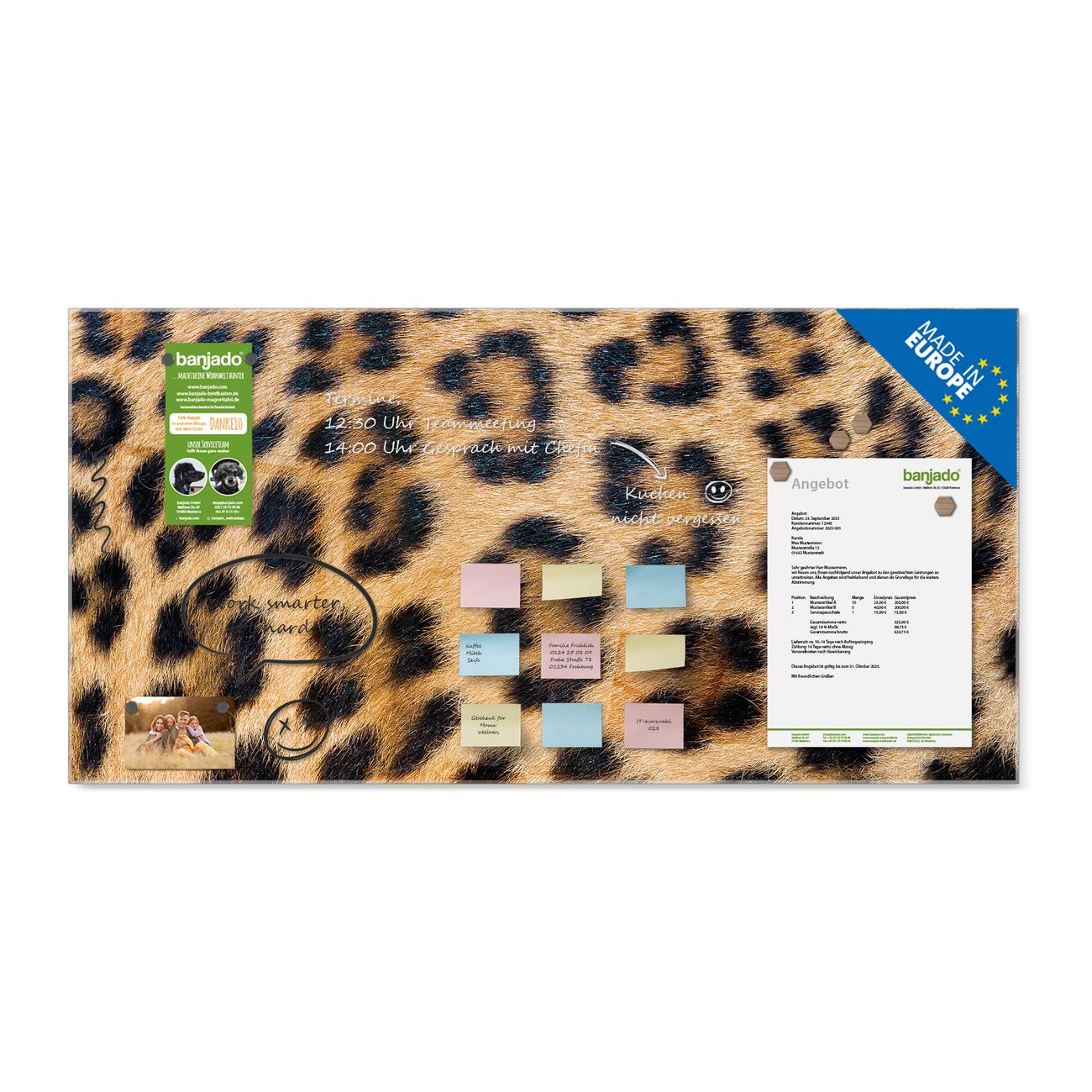 Ein Stück Design, das Ihren Alltag organisiert. Schreiben, heften, inspirieren - alles an einem Ort. Qualität, die man spürt. Montage leicht gemacht. Handwerk mit Herz - veredelt in Sachsen. Einzigartiges Design mit Motiv Motiv Leopardenfell Beschreibbare Glasoberfläche, leicht zu reinigen Starke Magnetkraft durch Stahlrückwand Inklusive 4 Neodym-Magneten Flexible Montageoptionen Handveredelt in Sachsen - Qualität, die bleibt