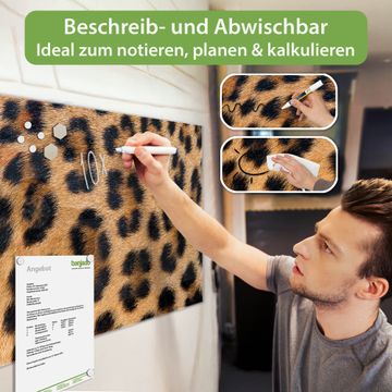 Die banjado Glas Magnettafel mit dem Motiv Motiv Leopardenfell verbindet Funktionalität mit Stil. Sie ersetzt das Zettelchaos durch klare Strukturen und bringt dabei eine warme, natürliche Atmosphäre in Ihr Zuhause. Ob im Büro, in der Küche oder im Eingangsbereich - dieses Design-Board zieht Blicke an und sorgt für Ordnung mit Charakter.