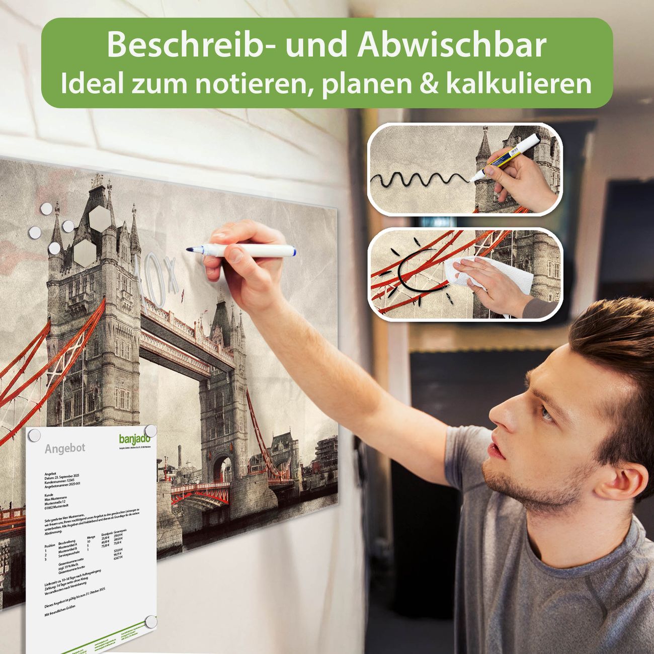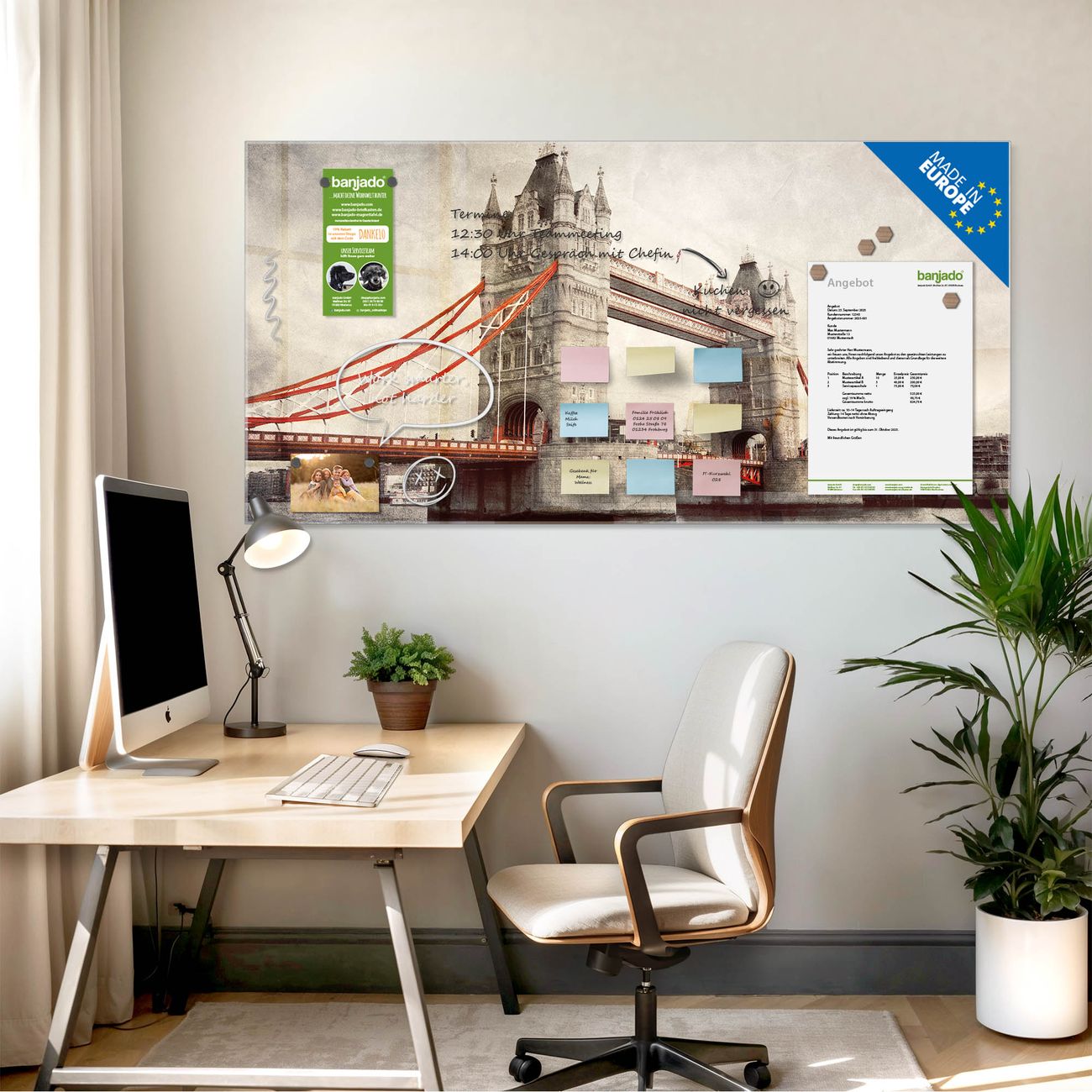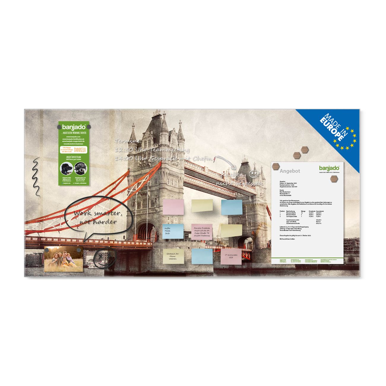 Die banjado Glas Magnettafel mit dem Motiv Motiv London Bridge verbindet Funktionalität mit Stil. Sie ersetzt das Zettelchaos durch klare Strukturen und bringt dabei eine warme, natürliche Atmosphäre in Ihr Zuhause. Ob im Büro, in der Küche oder im Eingangsbereich - dieses Design-Board zieht Blicke an und sorgt für Ordnung mit Charakter.
