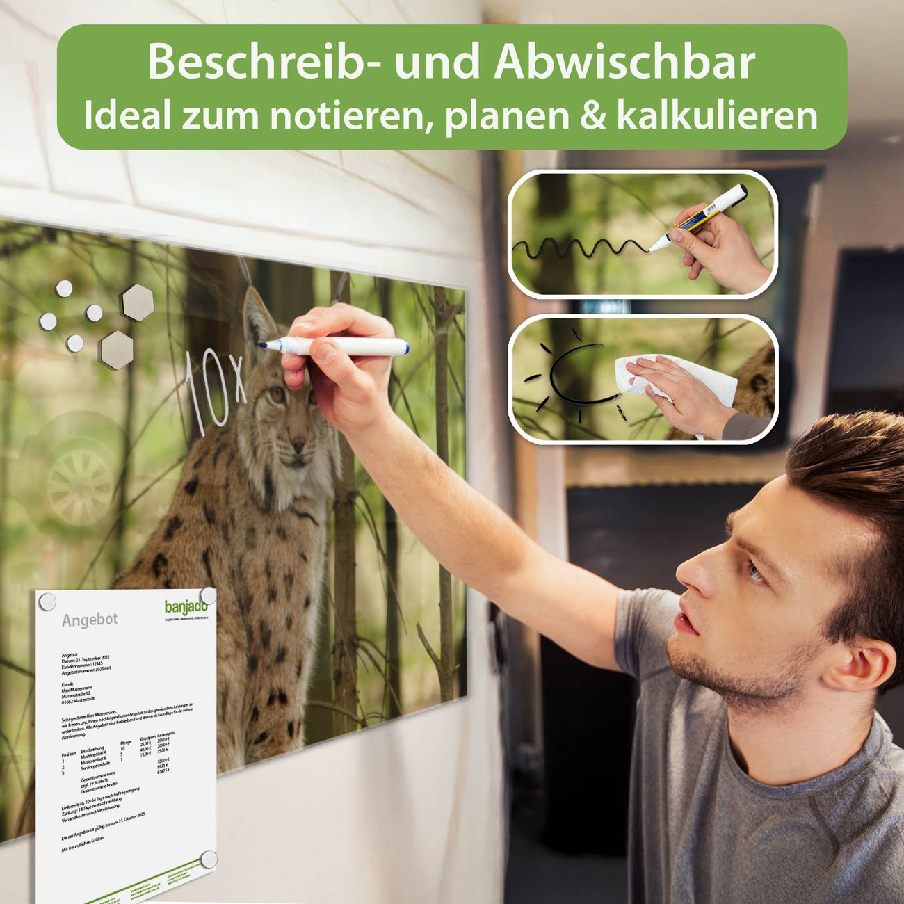 Jede Glas Magnettafel wird in unserer Werkstatt von Hand gefertigt und sorgfältig geprüft. So erhalten Sie ein echtes Qualitätsprodukt, das Funktion und Ästhetik perfekt vereint.?? Warum banjado?