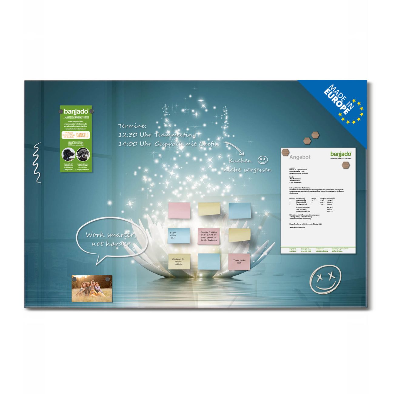 Jede Glas Magnettafel wird in unserer Werkstatt von Hand gefertigt und sorgfältig geprüft. So erhalten Sie ein echtes Qualitätsprodukt, das Funktion und Ästhetik perfekt vereint.?? Warum banjado?