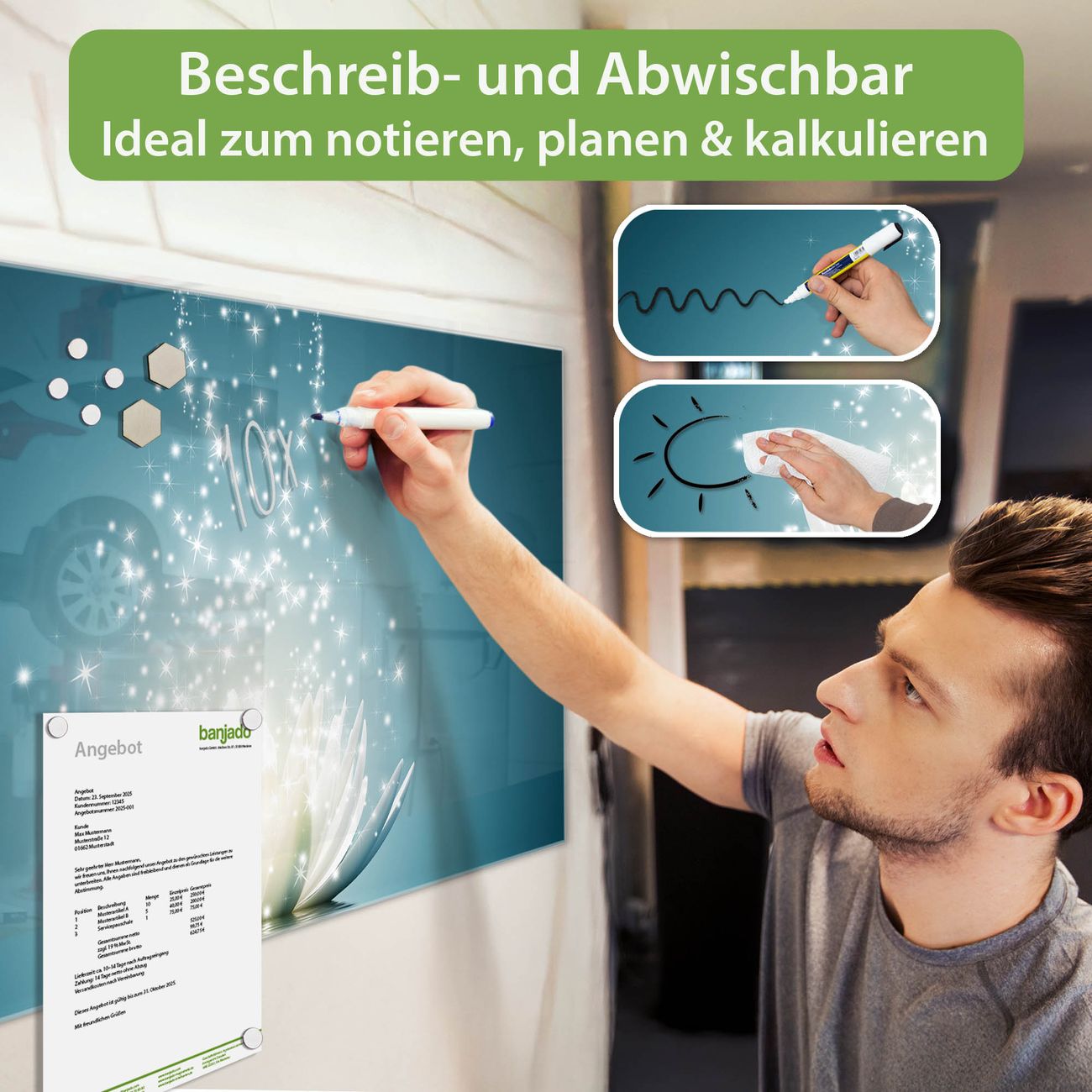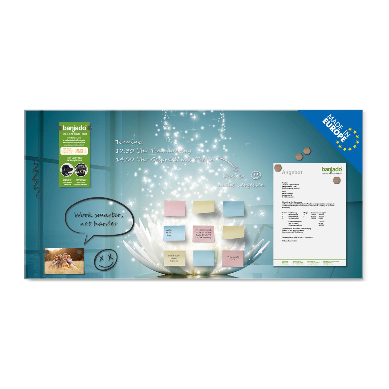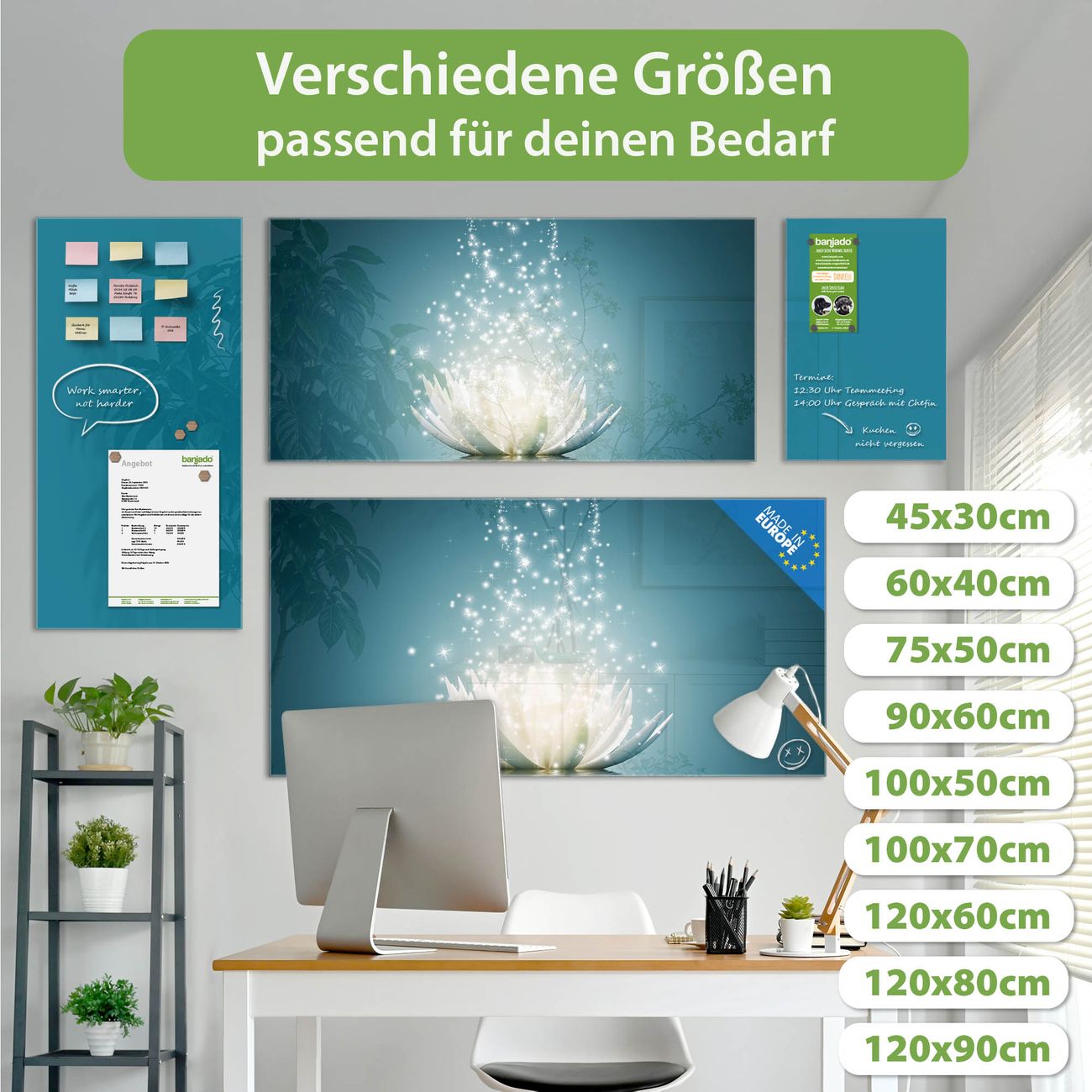 Die banjado Glas Magnettafel mit dem Motiv Motiv Magische Lotusblüte verbindet Funktionalität mit Stil. Sie ersetzt das Zettelchaos durch klare Strukturen und bringt dabei eine warme, natürliche Atmosphäre in Ihr Zuhause. Ob im Büro, in der Küche oder im Eingangsbereich - dieses Design-Board zieht Blicke an und sorgt für Ordnung mit Charakter.