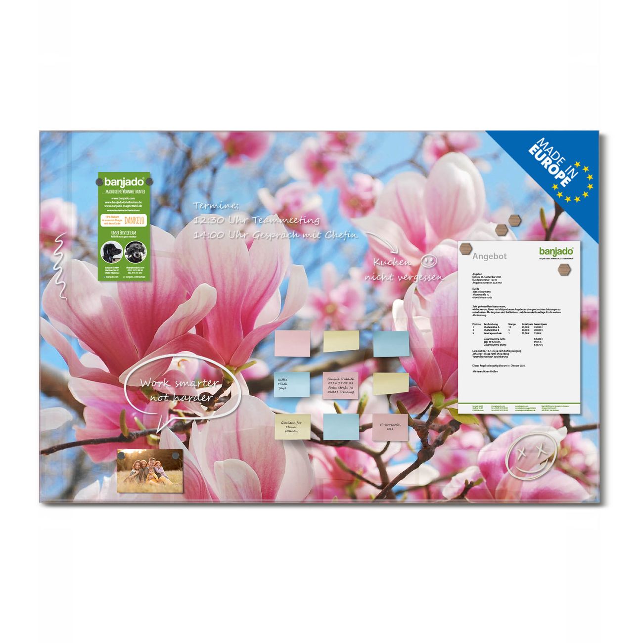 Jede Glas Magnettafel wird in unserer Werkstatt von Hand gefertigt und sorgfältig geprüft. So erhalten Sie ein echtes Qualitätsprodukt, das Funktion und Ästhetik perfekt vereint.?? Warum banjado?