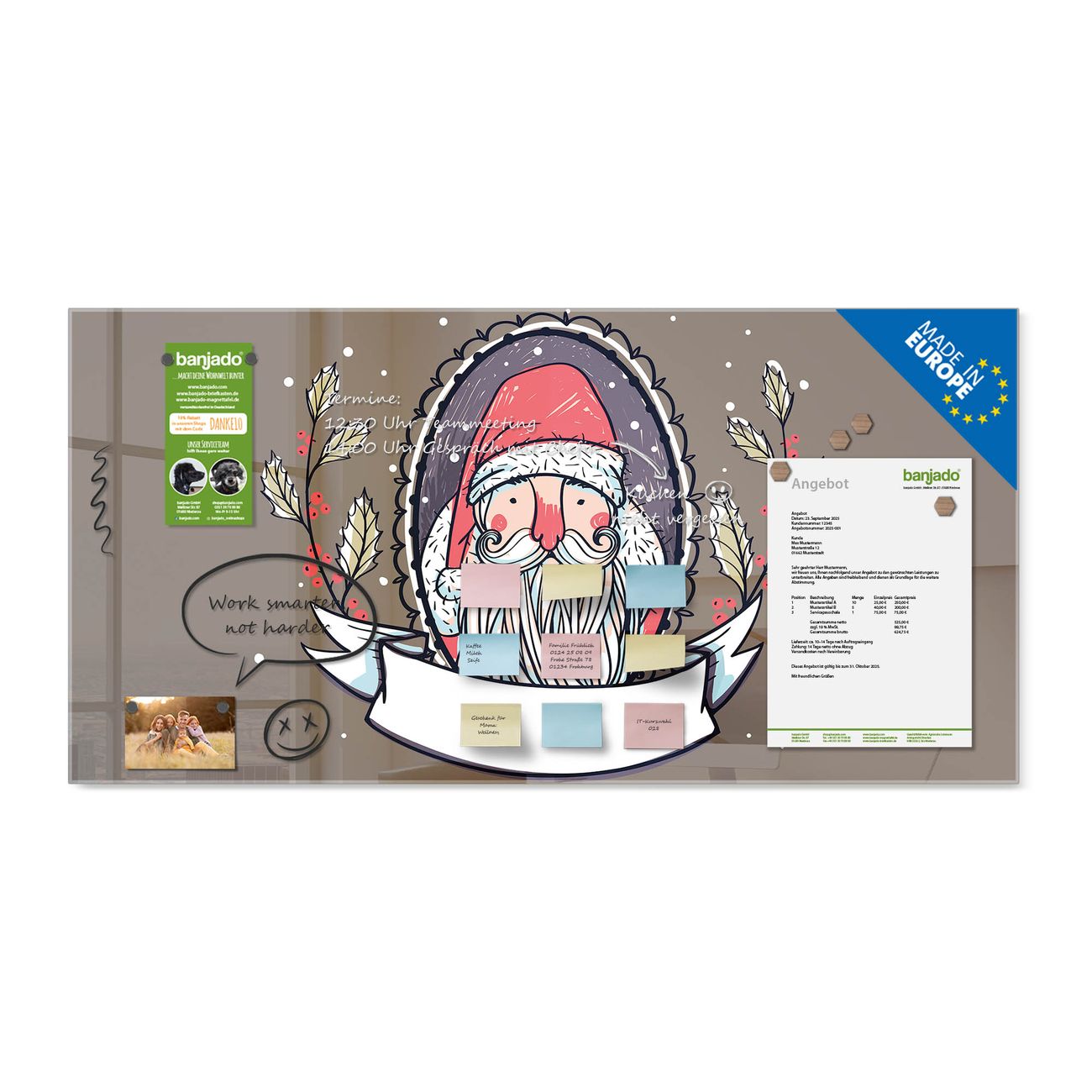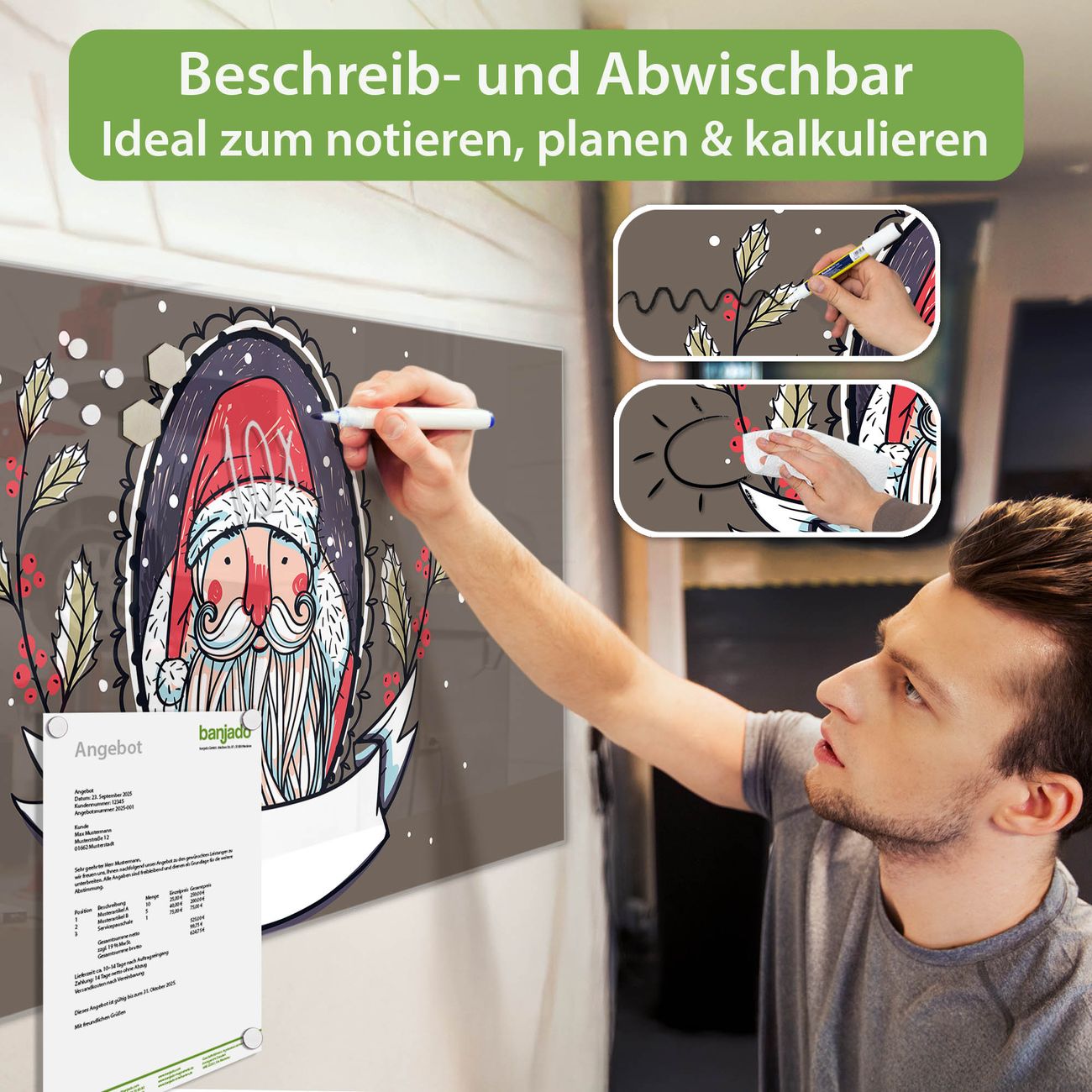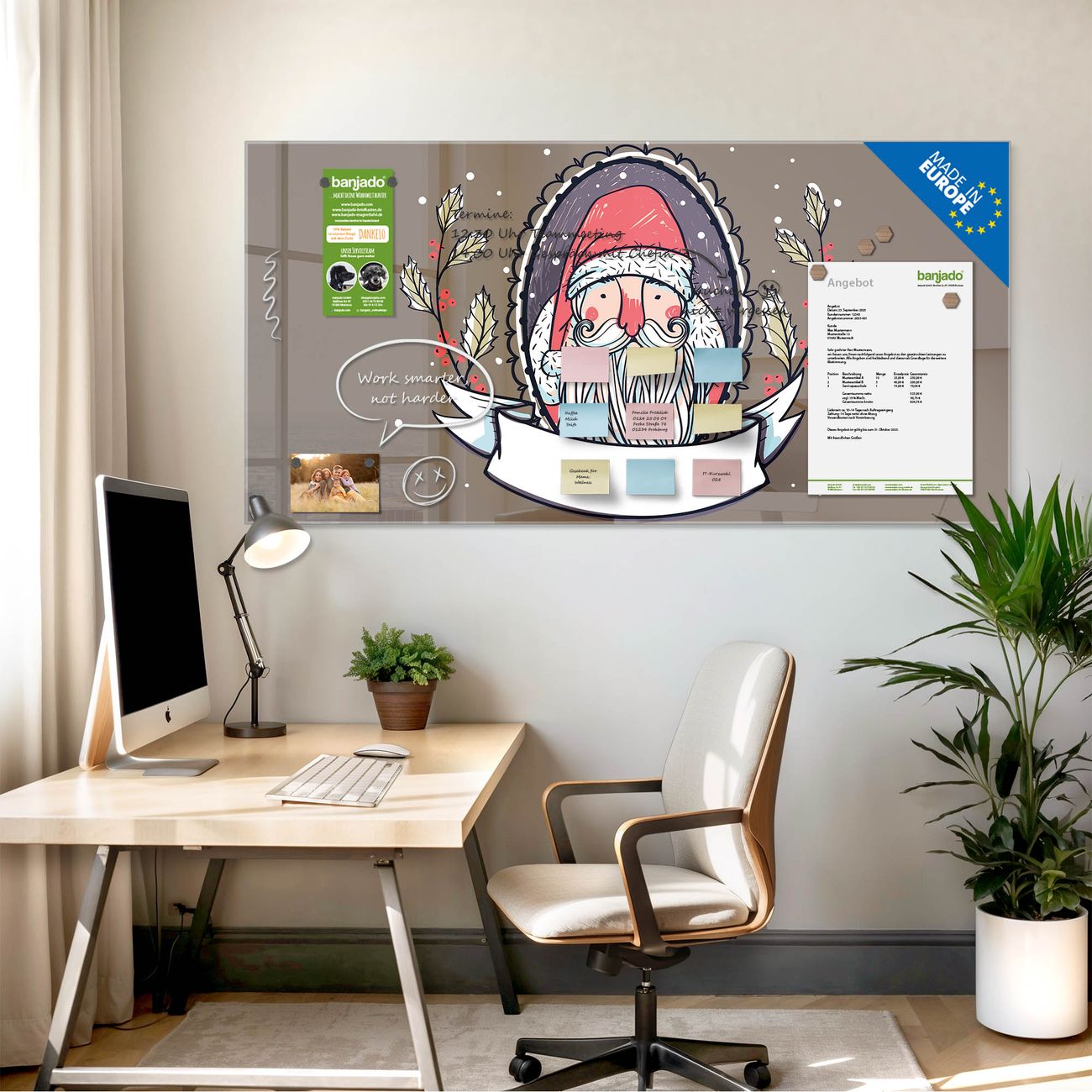 Jede Glas Magnettafel wird in unserer Werkstatt von Hand gefertigt und sorgfältig geprüft. So erhalten Sie ein echtes Qualitätsprodukt, das Funktion und Ästhetik perfekt vereint.?? Warum banjado?