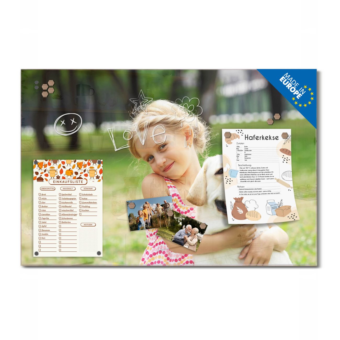 Ein Stück Design, das Ihren Alltag organisiert. Schreiben, heften, inspirieren - alles an einem Ort. Qualität, die man spürt. Montage leicht gemacht. Handwerk mit Herz - veredelt in Sachsen. Einzigartiges Design mit Motiv Motiv Wunschmotiv Beschreibbare Glasoberfläche, leicht zu reinigen Starke Magnetkraft durch Stahlrückwand Inklusive 4 Neodym-Magneten Flexible Montageoptionen Handveredelt in Sachsen - Qualität, die bleibt