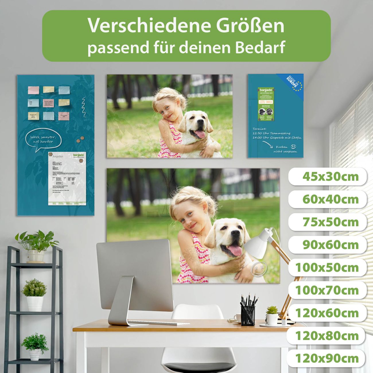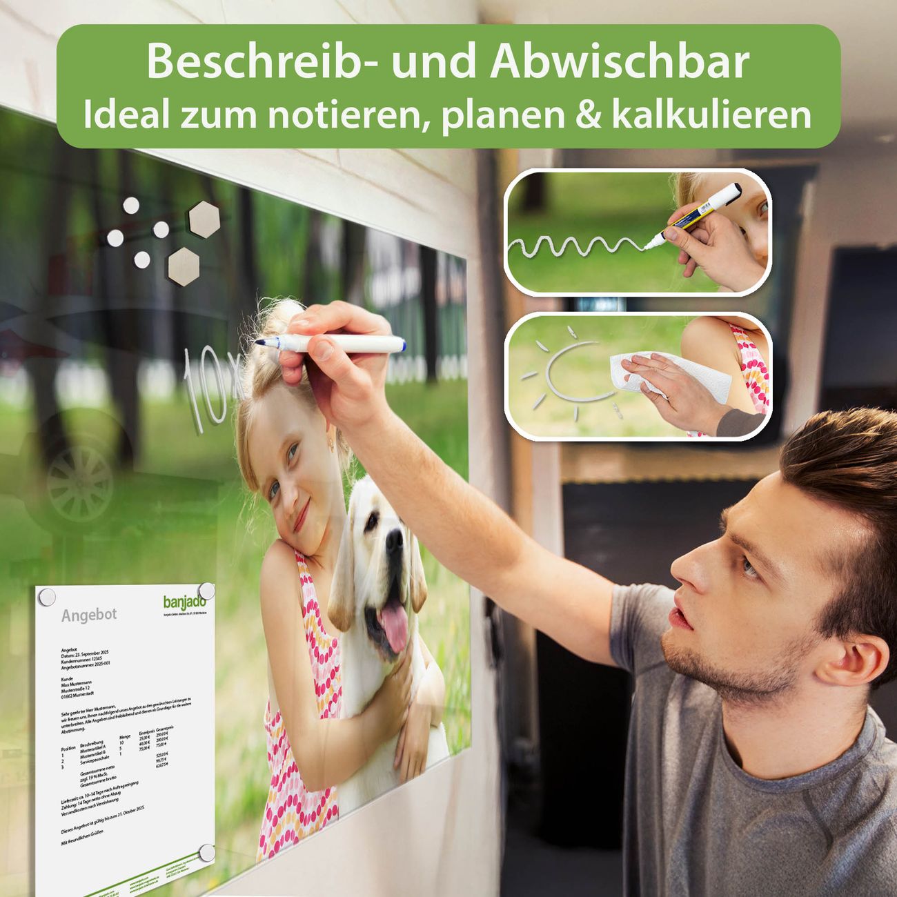 Jede Glas Magnettafel wird in unserer Werkstatt von Hand gefertigt und sorgfältig geprüft. So erhalten Sie ein echtes Qualitätsprodukt, das Funktion und Ästhetik perfekt vereint.?? Warum banjado?