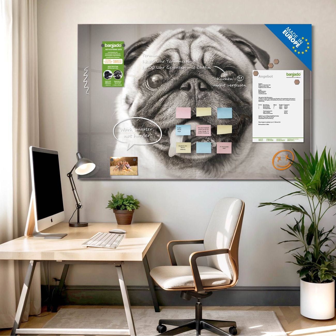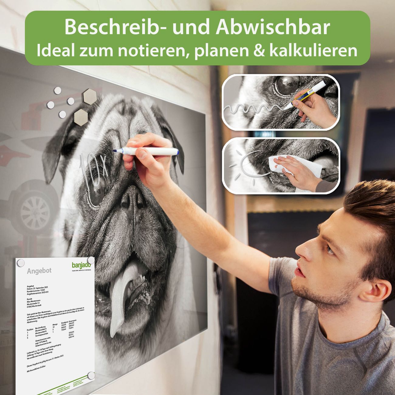 Jede Glas Magnettafel wird in unserer Werkstatt von Hand gefertigt und sorgfältig geprüft. So erhalten Sie ein echtes Qualitätsprodukt, das Funktion und Ästhetik perfekt vereint.?? Warum banjado?