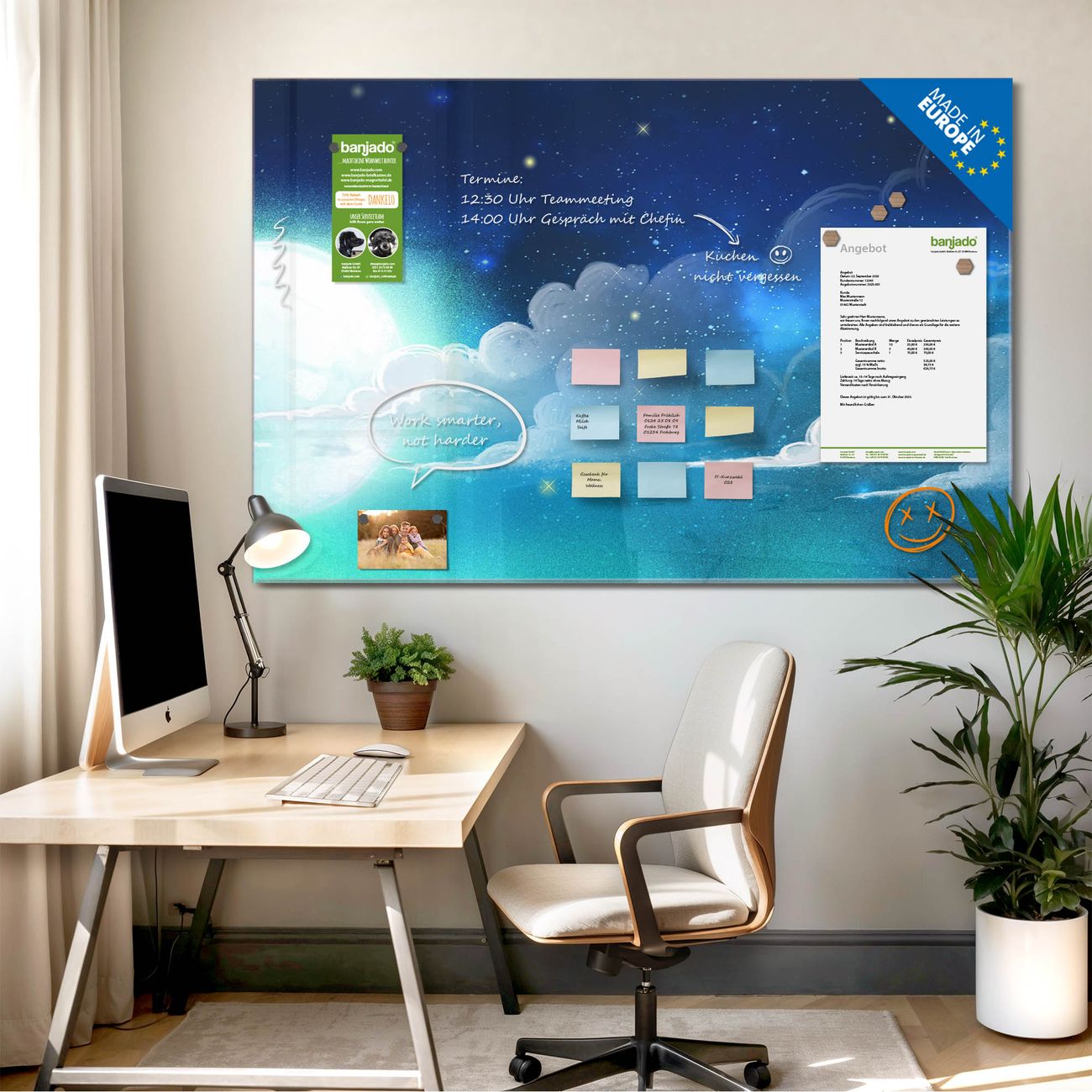 Jede Glas Magnettafel wird in unserer Werkstatt von Hand gefertigt und sorgfältig geprüft. So erhalten Sie ein echtes Qualitätsprodukt, das Funktion und Ästhetik perfekt vereint.?? Warum banjado?