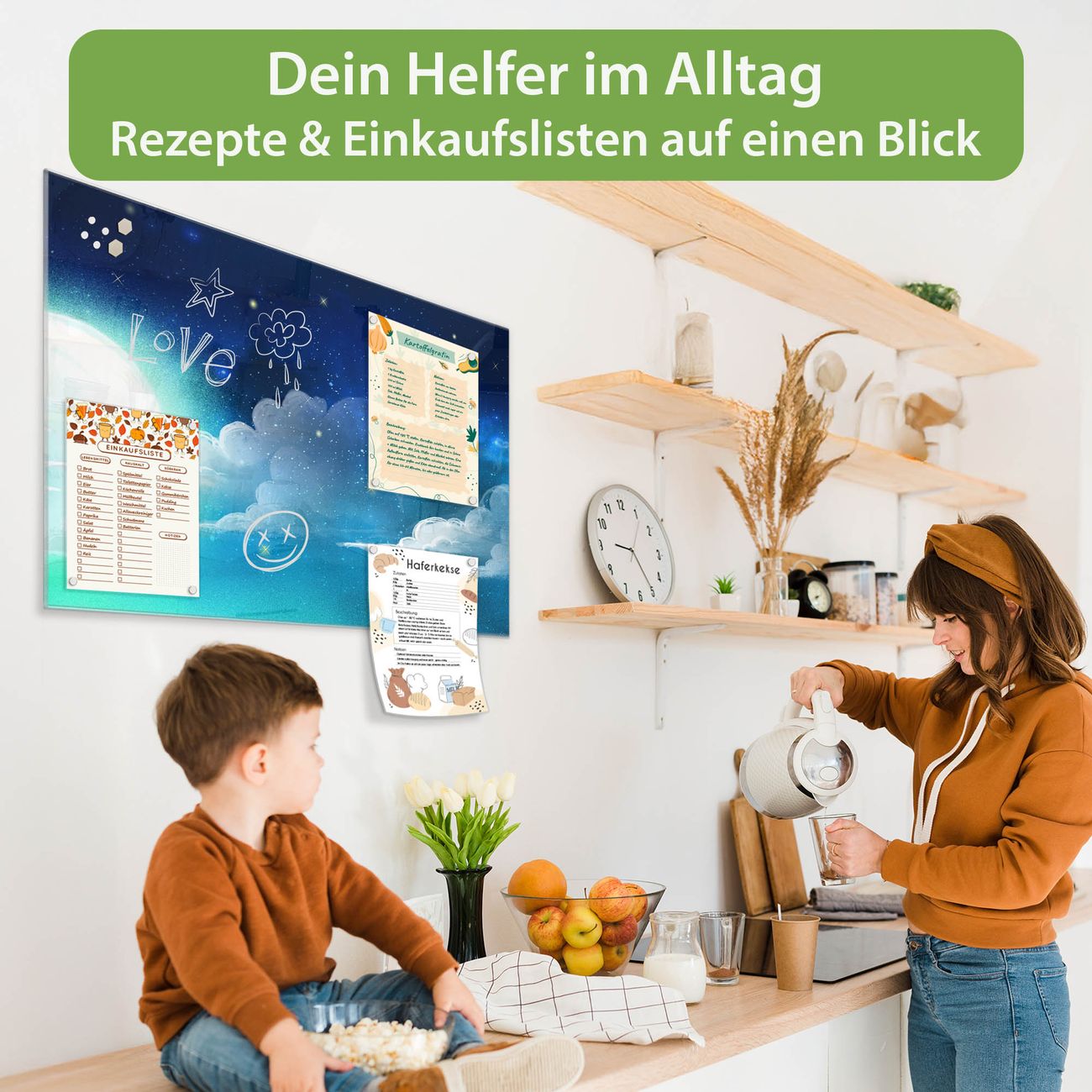 Auf der glatten Glasoberfläche lassen sich Termine, Rezepte oder Notizen ganz einfach mit Kreidestiften festhalten und rückstandslos entfernen. Starke Neodym-Magnete halten Ihre wichtigsten Erinnerungen sicher an Ort und Stelle. So entsteht Ihre ganz persönliche Ideenwand - jeden Tag neu.