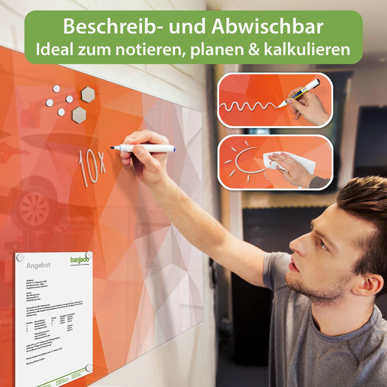 Die banjado Glas Magnettafel mit dem Motiv Motiv Orange Polygon verbindet Funktionalität mit Stil. Sie ersetzt das Zettelchaos durch klare Strukturen und bringt dabei eine warme, natürliche Atmosphäre in Ihr Zuhause. Ob im Büro, in der Küche oder im Eingangsbereich - dieses Design-Board zieht Blicke an und sorgt für Ordnung mit Charakter.