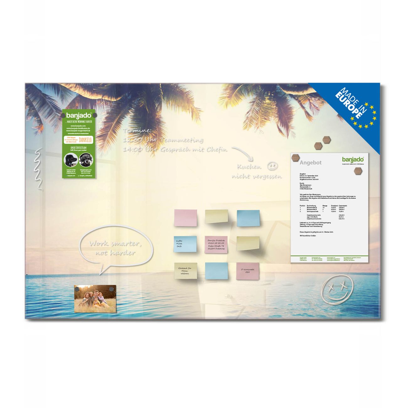 Jede Glas Magnettafel wird in unserer Werkstatt von Hand gefertigt und sorgfältig geprüft. So erhalten Sie ein echtes Qualitätsprodukt, das Funktion und Ästhetik perfekt vereint.?? Warum banjado?