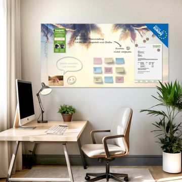 Die banjado Glas Magnettafel mit dem Motiv Motiv Paradis verbindet Funktionalität mit Stil. Sie ersetzt das Zettelchaos durch klare Strukturen und bringt dabei eine warme, natürliche Atmosphäre in Ihr Zuhause. Ob im Büro, in der Küche oder im Eingangsbereich - dieses Design-Board zieht Blicke an und sorgt für Ordnung mit Charakter.