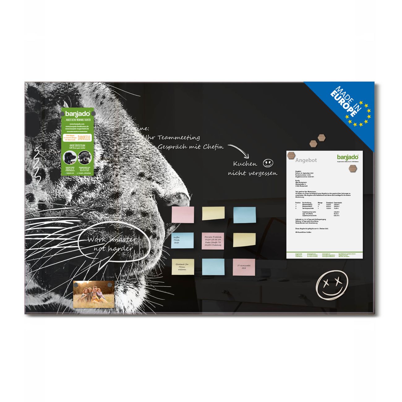Jede Glas Magnettafel wird in unserer Werkstatt von Hand gefertigt und sorgfältig geprüft. So erhalten Sie ein echtes Qualitätsprodukt, das Funktion und Ästhetik perfekt vereint.?? Warum banjado?