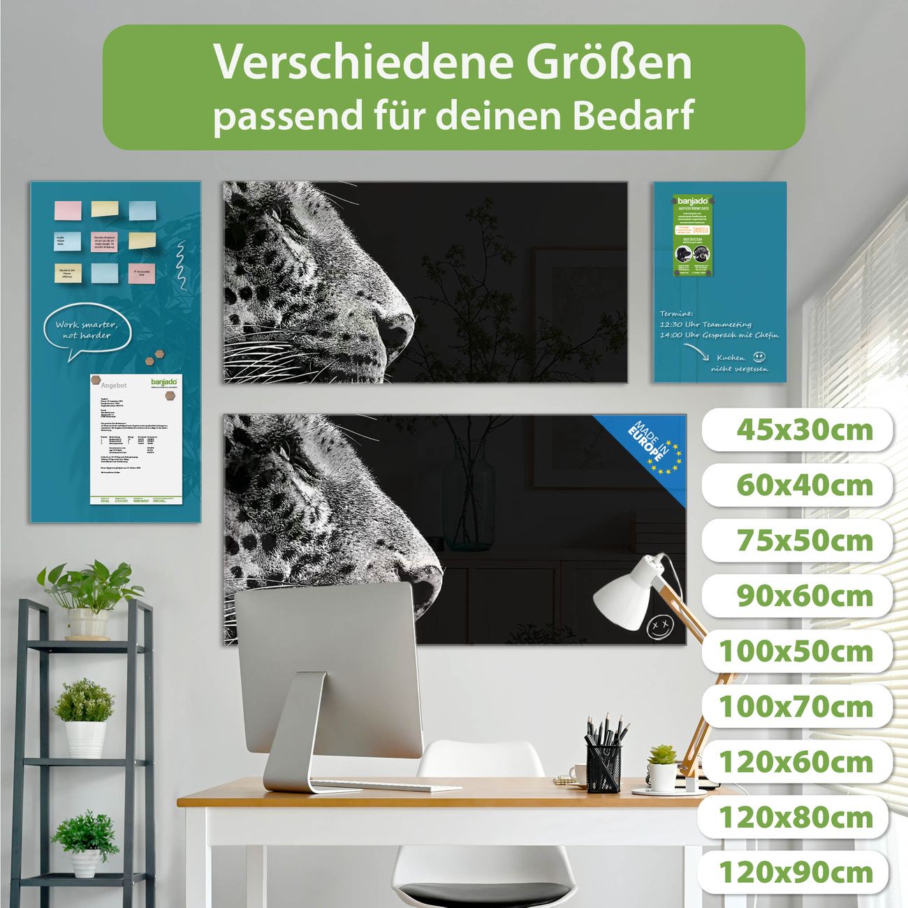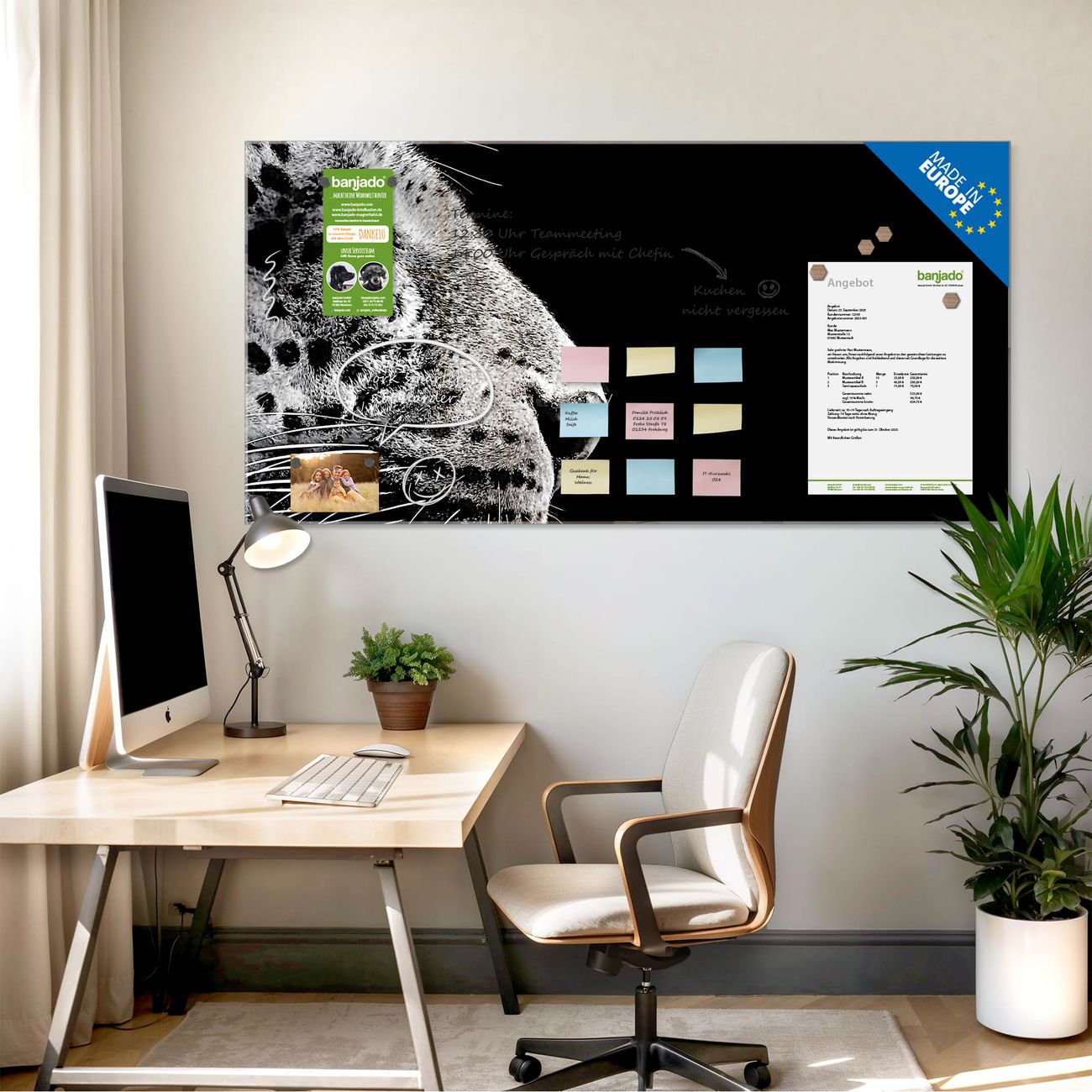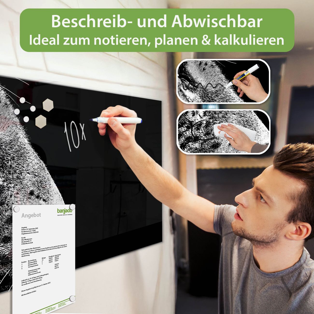Jede Glas Magnettafel wird in unserer Werkstatt von Hand gefertigt und sorgfältig geprüft. So erhalten Sie ein echtes Qualitätsprodukt, das Funktion und Ästhetik perfekt vereint.?? Warum banjado?