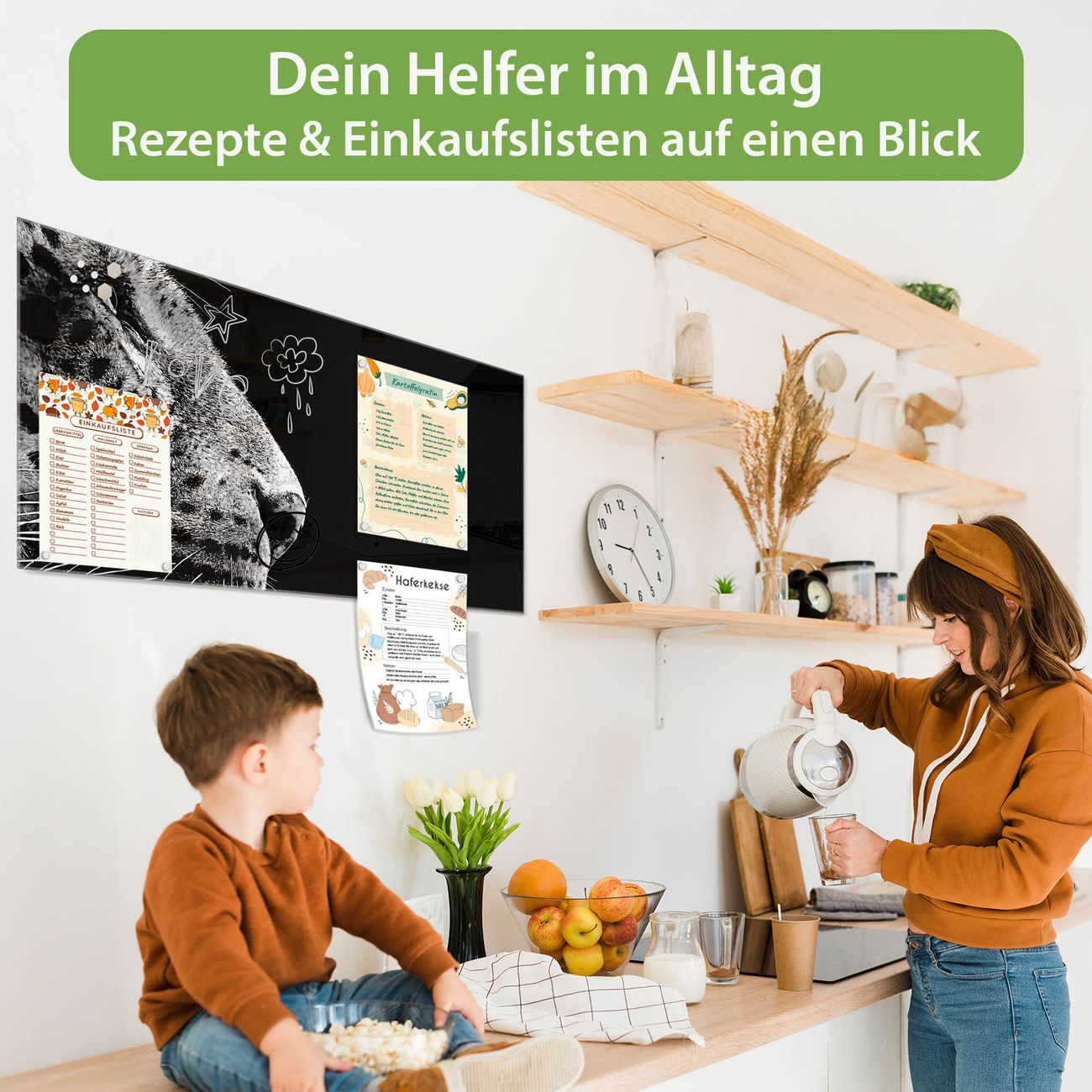 Auf der glatten Glasoberfläche lassen sich Termine, Rezepte oder Notizen ganz einfach mit Kreidestiften festhalten und rückstandslos entfernen. Starke Neodym-Magnete halten Ihre wichtigsten Erinnerungen sicher an Ort und Stelle. So entsteht Ihre ganz persönliche Ideenwand - jeden Tag neu.
