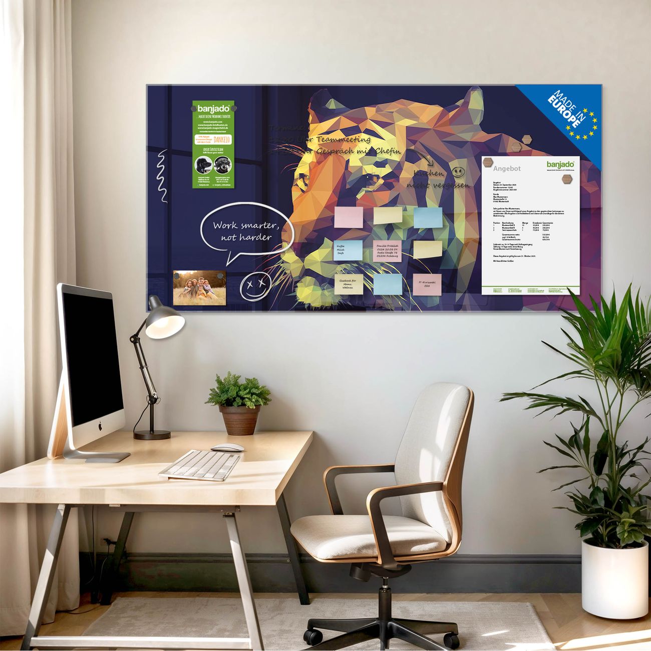 Jede Glas Magnettafel wird in unserer Werkstatt von Hand gefertigt und sorgfältig geprüft. So erhalten Sie ein echtes Qualitätsprodukt, das Funktion und Ästhetik perfekt vereint.?? Warum banjado?