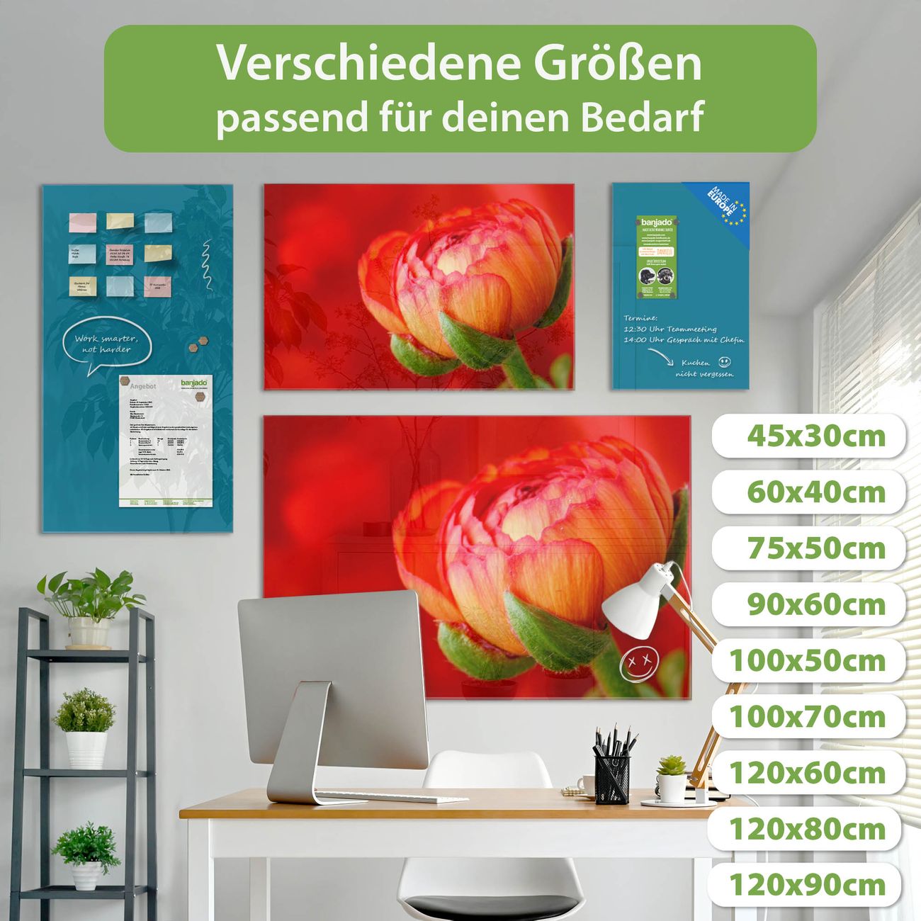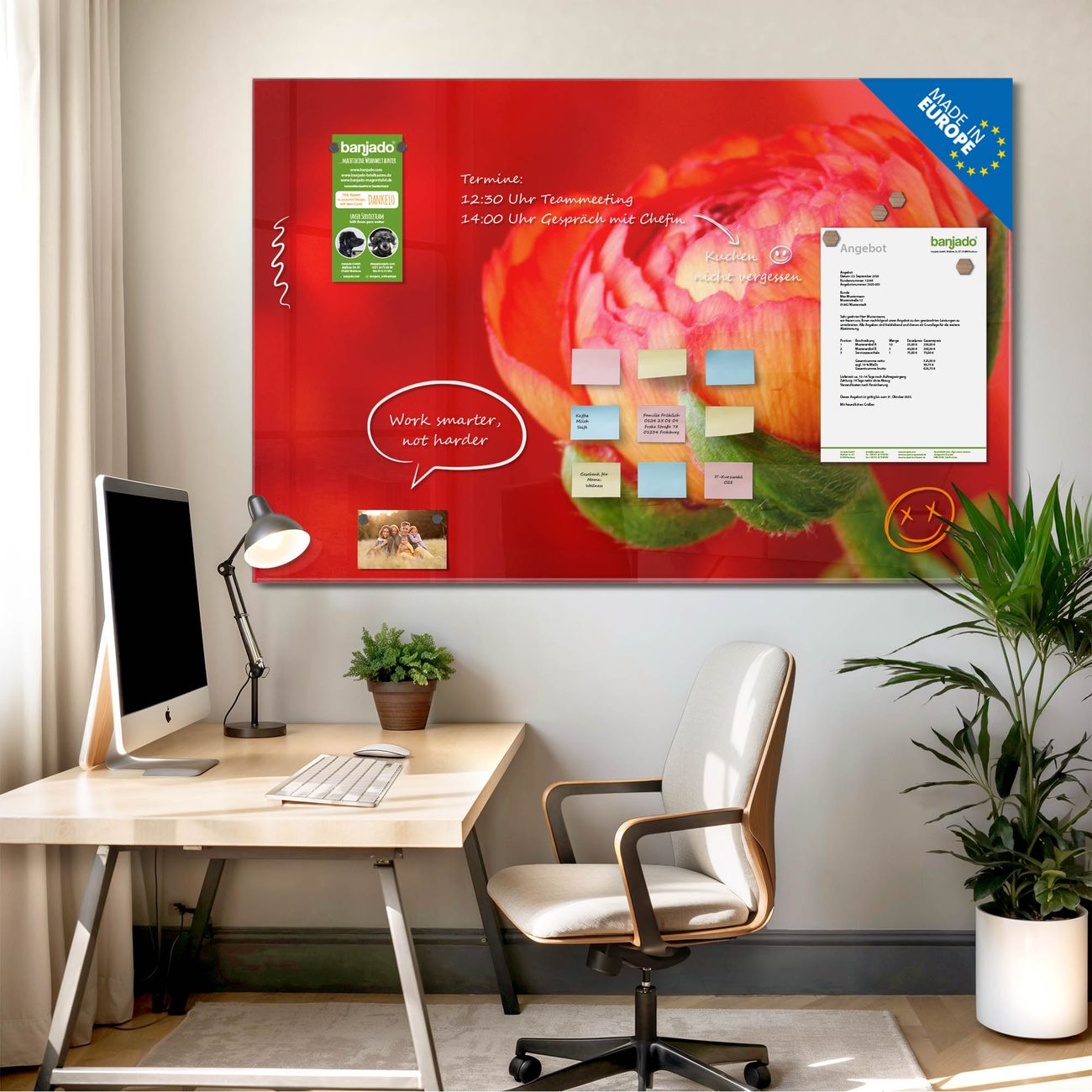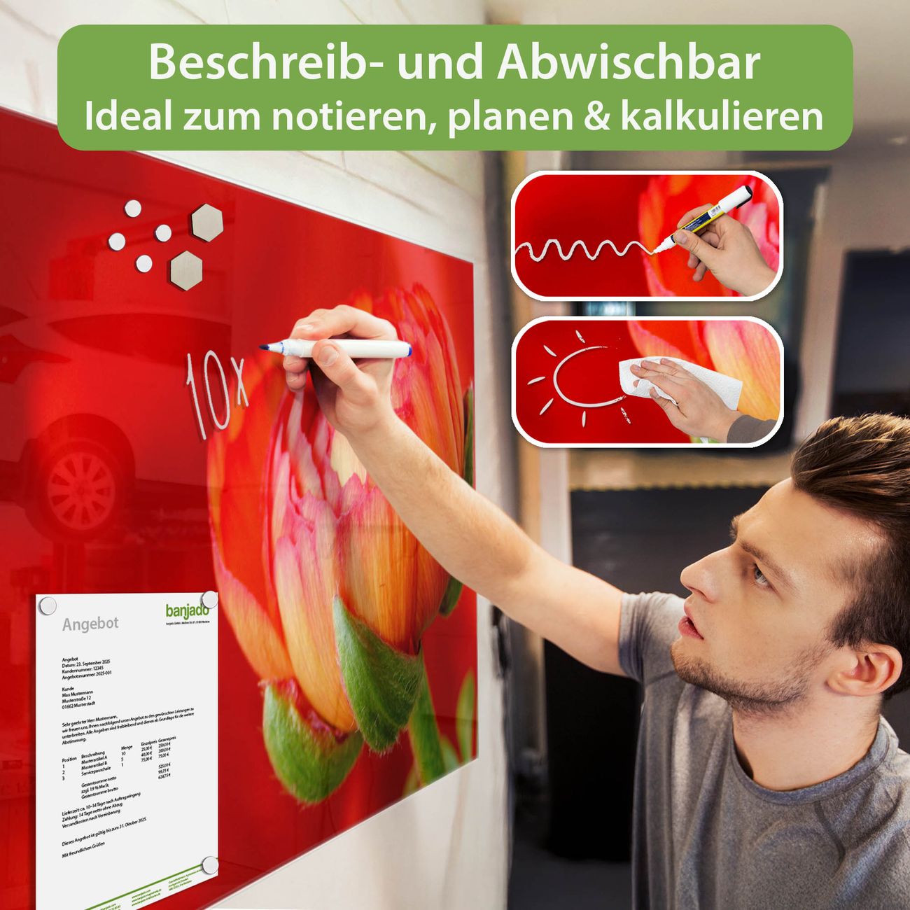 Jede Glas Magnettafel wird in unserer Werkstatt von Hand gefertigt und sorgfältig geprüft. So erhalten Sie ein echtes Qualitätsprodukt, das Funktion und Ästhetik perfekt vereint.?? Warum banjado?