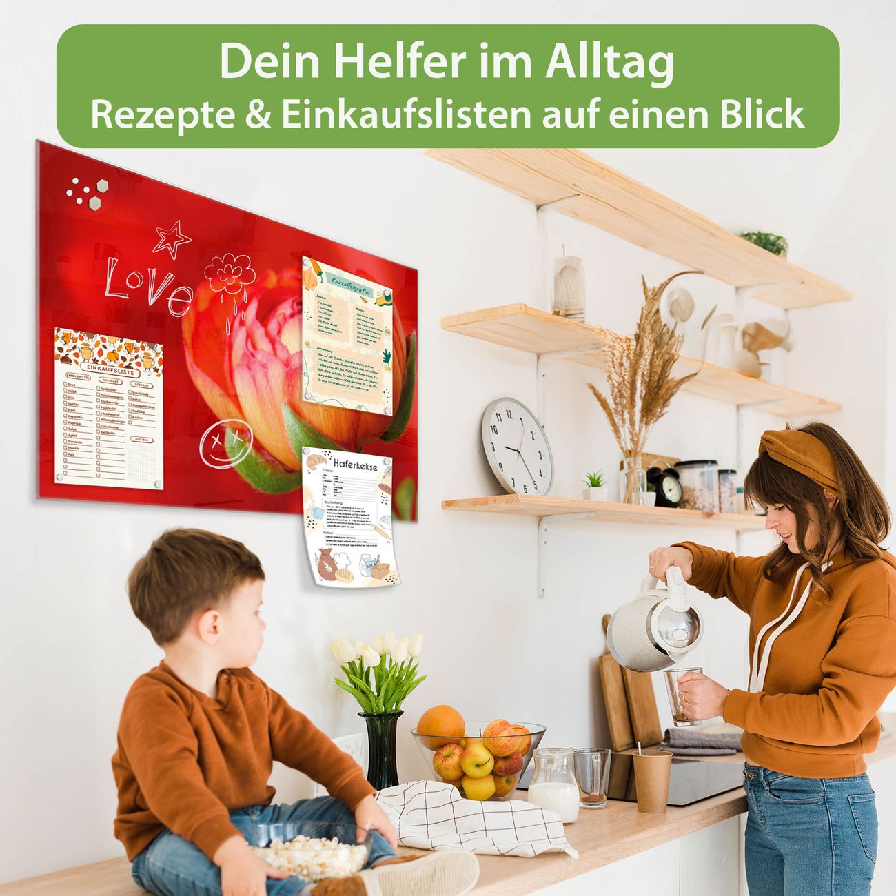 Auf der glatten Glasoberfläche lassen sich Termine, Rezepte oder Notizen ganz einfach mit Kreidestiften festhalten und rückstandslos entfernen. Starke Neodym-Magnete halten Ihre wichtigsten Erinnerungen sicher an Ort und Stelle. So entsteht Ihre ganz persönliche Ideenwand - jeden Tag neu.