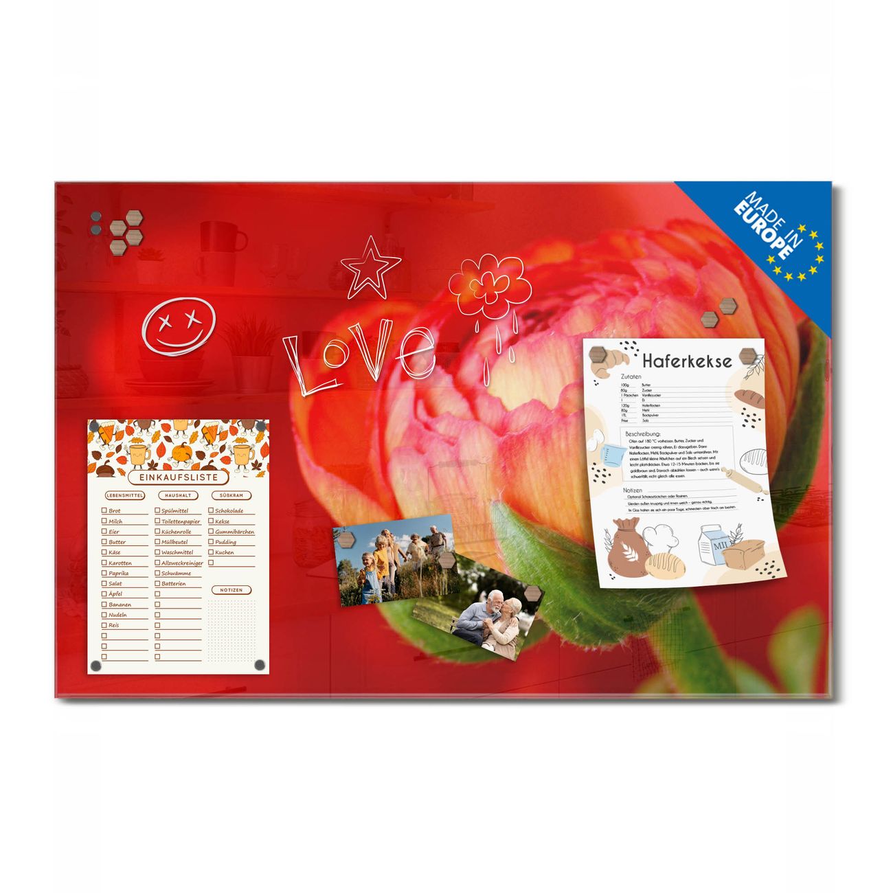 Auf der glatten Glasoberfläche lassen sich Termine, Rezepte oder Notizen ganz einfach mit Kreidestiften festhalten und rückstandslos entfernen. Starke Neodym-Magnete halten Ihre wichtigsten Erinnerungen sicher an Ort und Stelle. So entsteht Ihre ganz persönliche Ideenwand - jeden Tag neu.