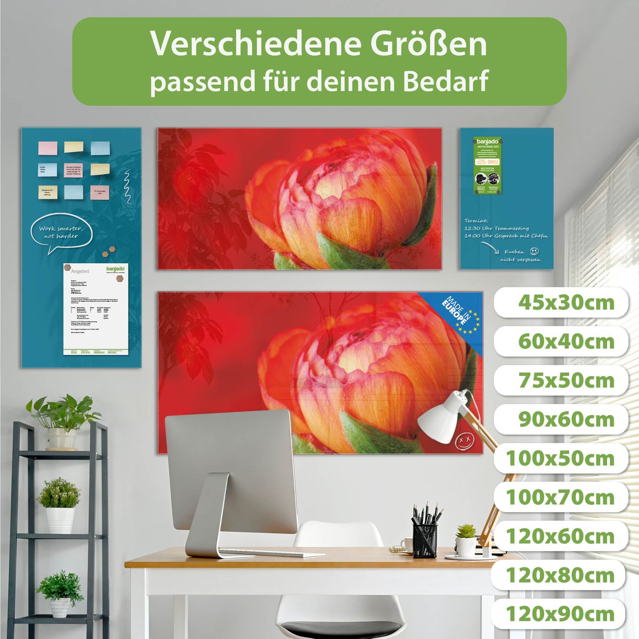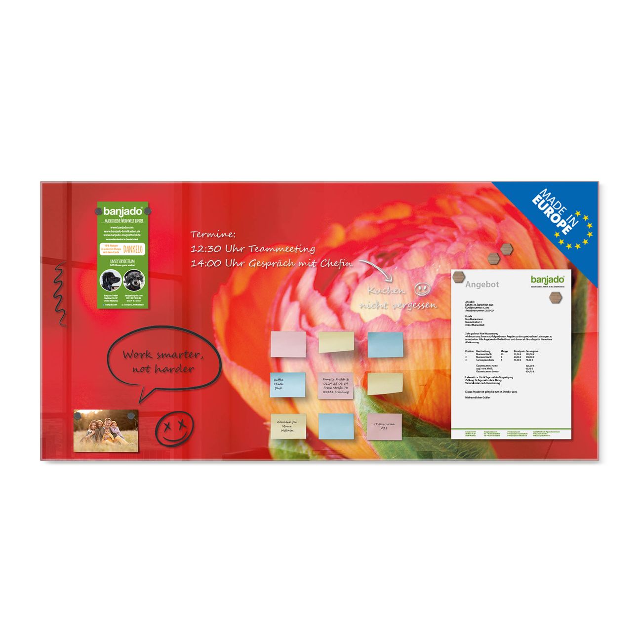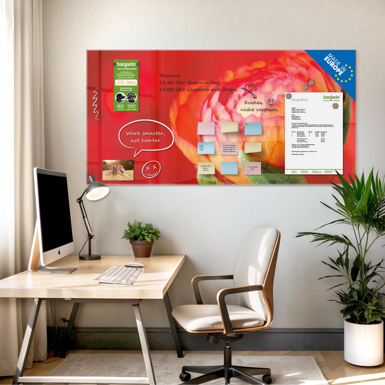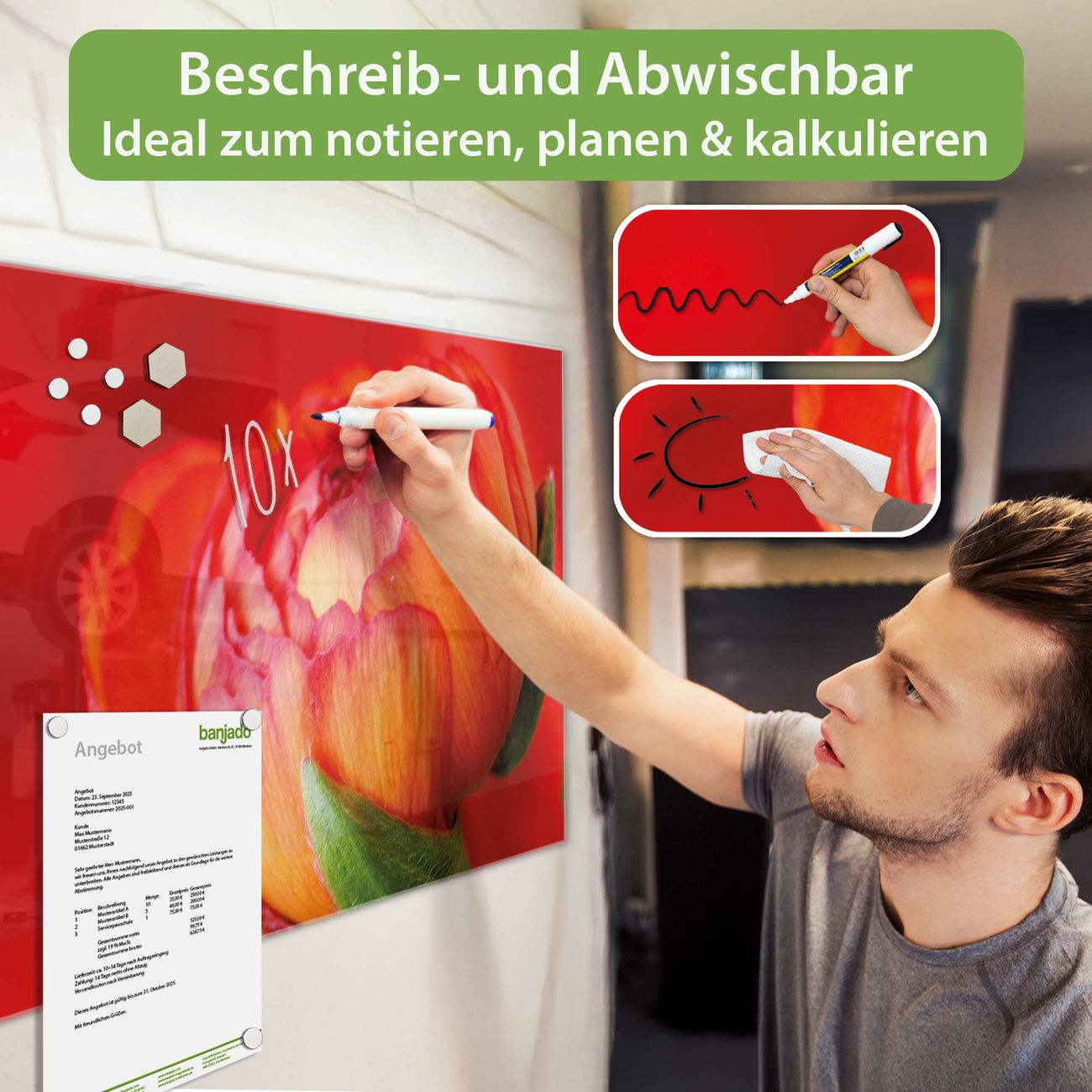 Jede Glas Magnettafel wird in unserer Werkstatt von Hand gefertigt und sorgfältig geprüft. So erhalten Sie ein echtes Qualitätsprodukt, das Funktion und Ästhetik perfekt vereint.?? Warum banjado?