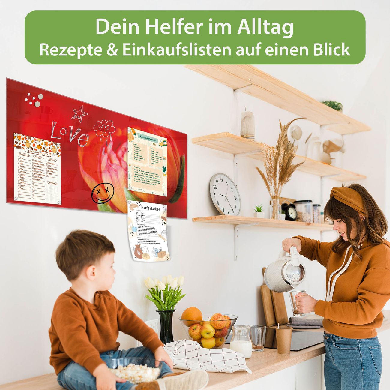 Auf der glatten Glasoberfläche lassen sich Termine, Rezepte oder Notizen ganz einfach mit Kreidestiften festhalten und rückstandslos entfernen. Starke Neodym-Magnete halten Ihre wichtigsten Erinnerungen sicher an Ort und Stelle. So entsteht Ihre ganz persönliche Ideenwand - jeden Tag neu.