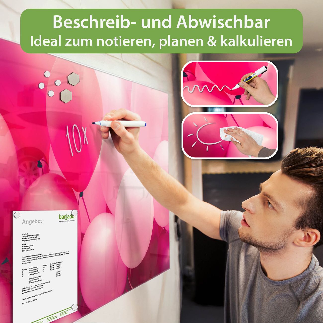 Die banjado Glas Magnettafel mit dem Motiv Motiv Rosa Ballons 2 verbindet Funktionalität mit Stil. Sie ersetzt das Zettelchaos durch klare Strukturen und bringt dabei eine warme, natürliche Atmosphäre in Ihr Zuhause. Ob im Büro, in der Küche oder im Eingangsbereich - dieses Design-Board zieht Blicke an und sorgt für Ordnung mit Charakter.