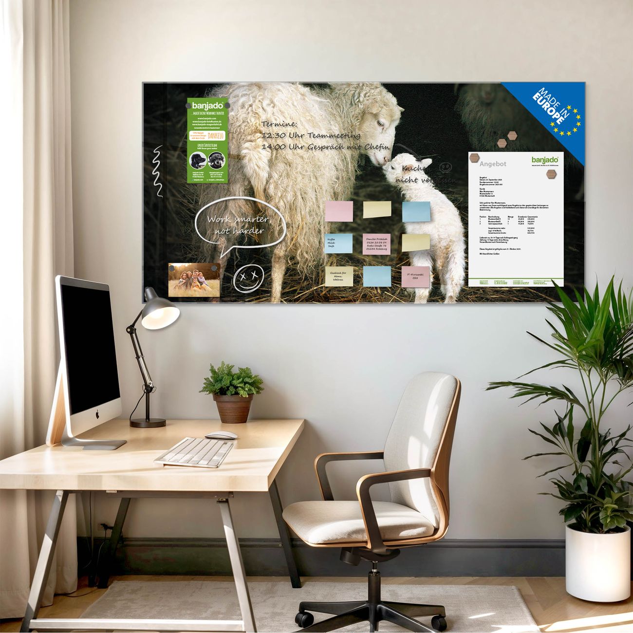 Jede Glas Magnettafel wird in unserer Werkstatt von Hand gefertigt und sorgfältig geprüft. So erhalten Sie ein echtes Qualitätsprodukt, das Funktion und Ästhetik perfekt vereint.?? Warum banjado?