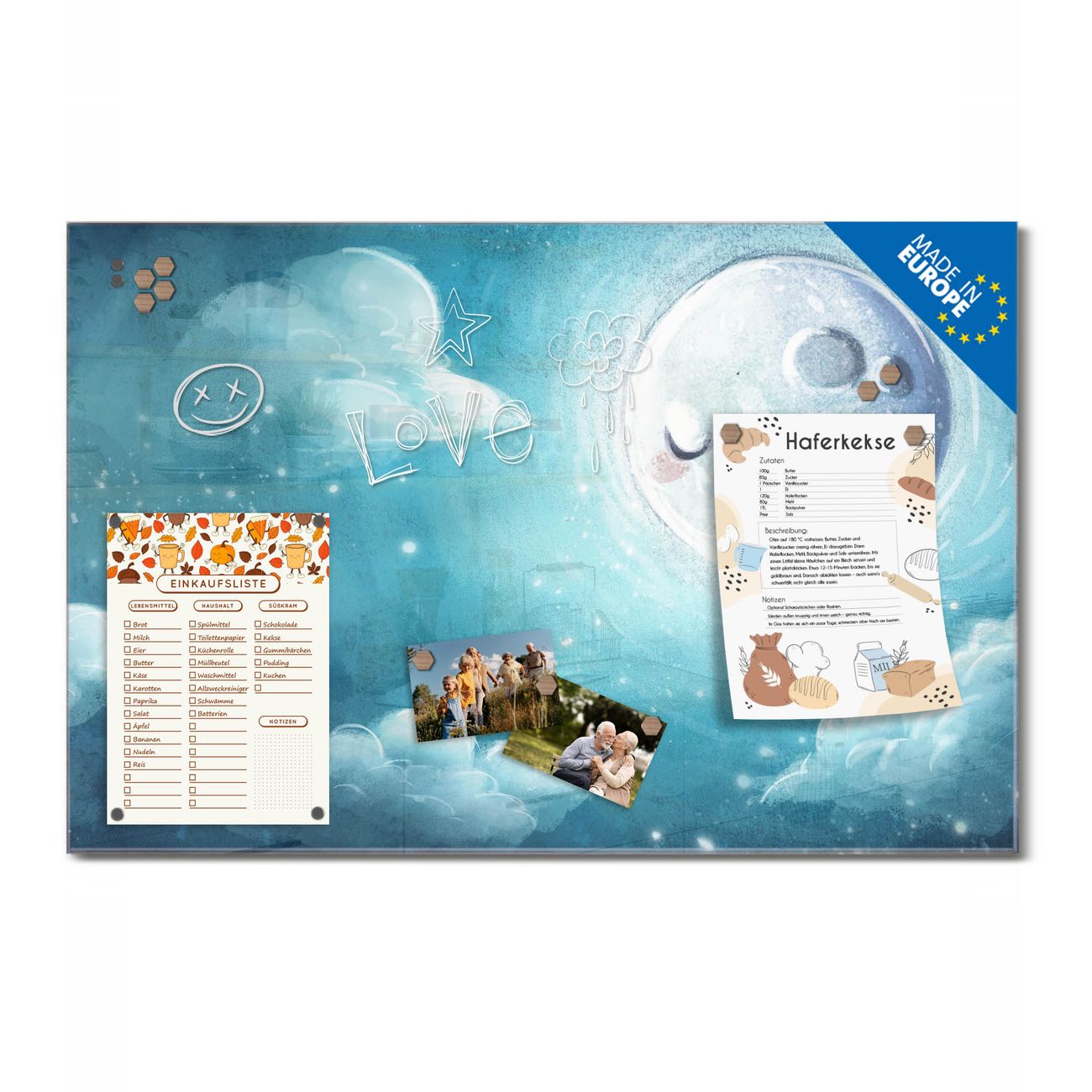 Ein Stück Design, das Ihren Alltag organisiert. Schreiben, heften, inspirieren - alles an einem Ort. Qualität, die man spürt. Montage leicht gemacht. Handwerk mit Herz - veredelt in Sachsen. Einzigartiges Design mit Motiv Motiv schlafender Mond Beschreibbare Glasoberfläche, leicht zu reinigen Starke Magnetkraft durch Stahlrückwand Inklusive 4 Neodym-Magneten Flexible Montageoptionen Handveredelt in Sachsen - Qualität, die bleibt