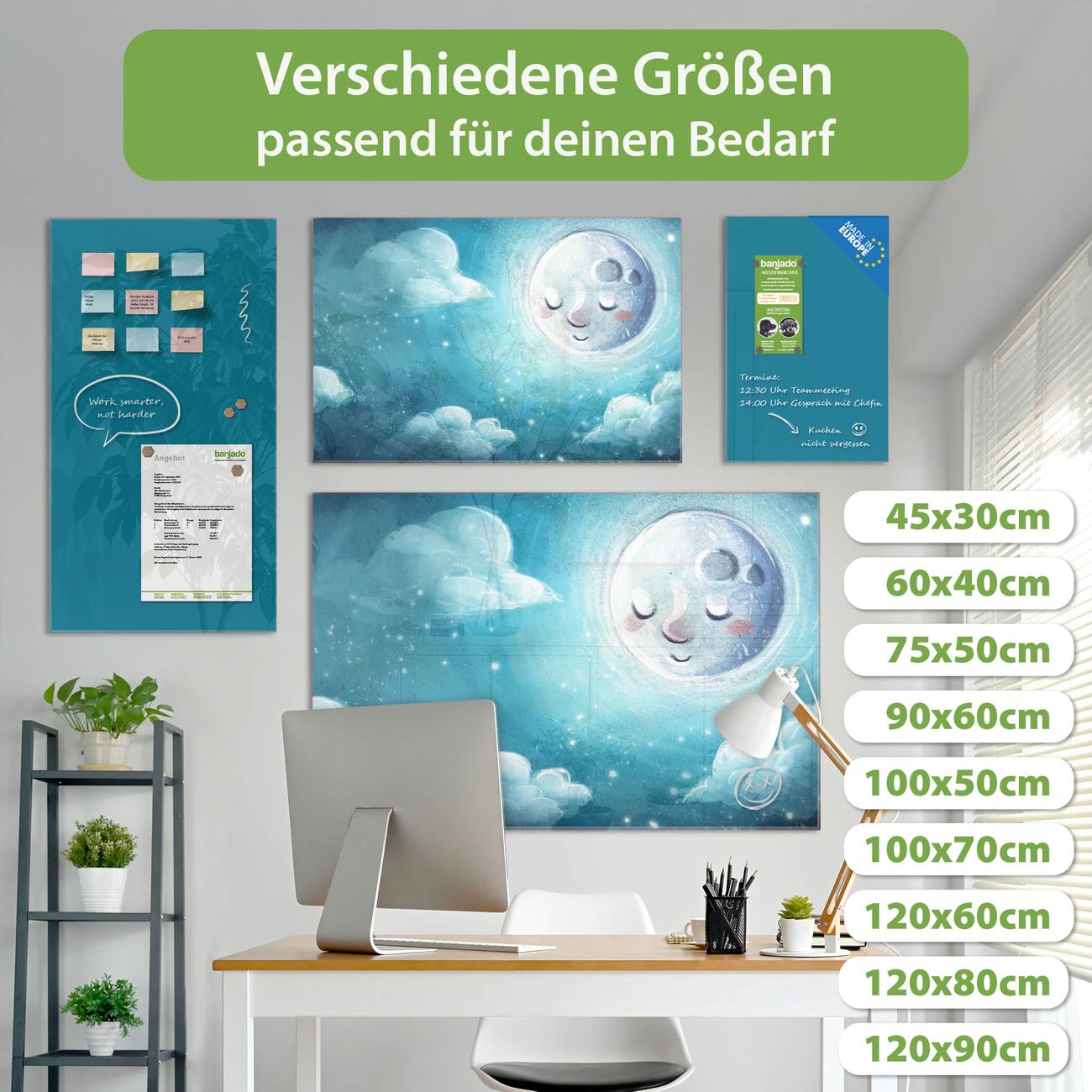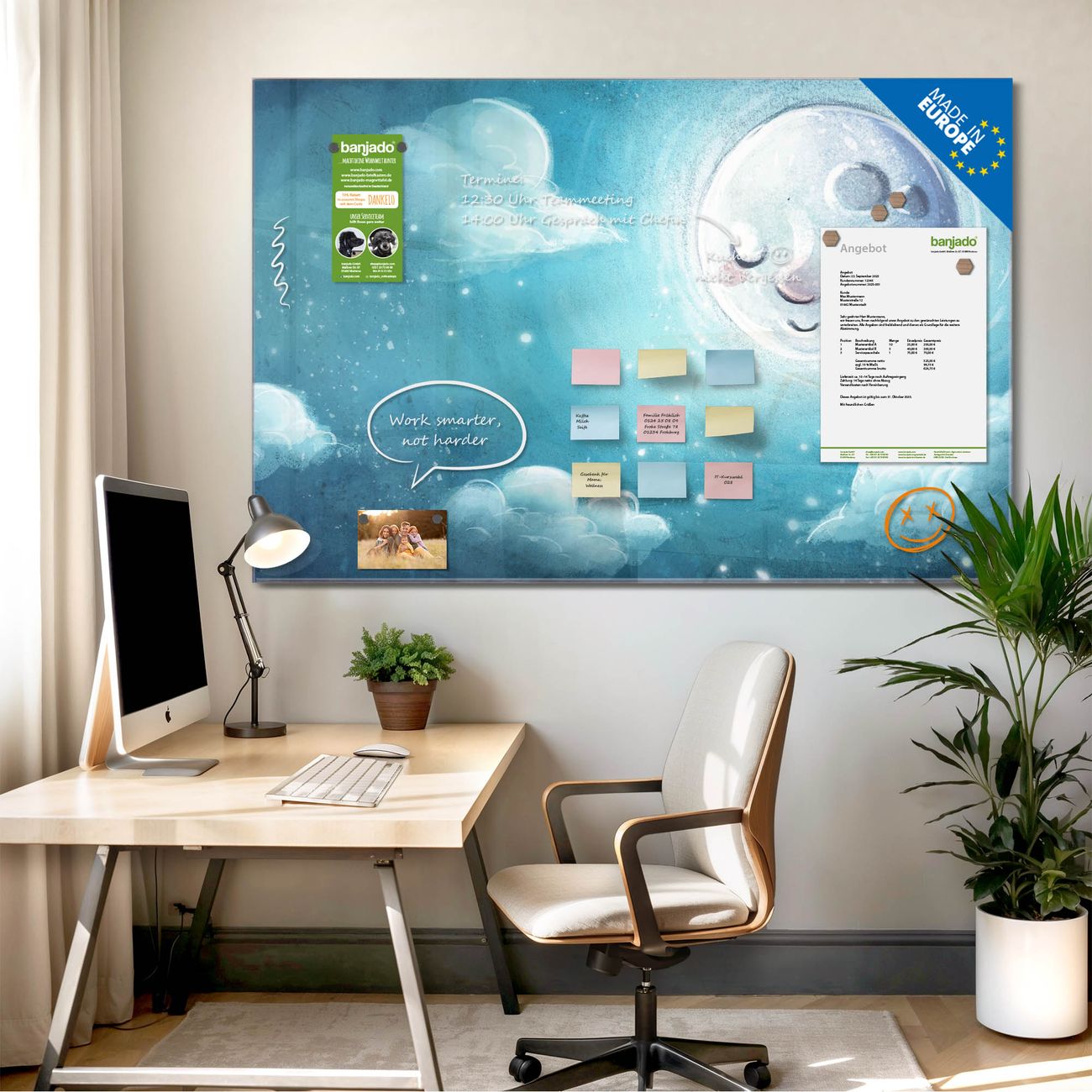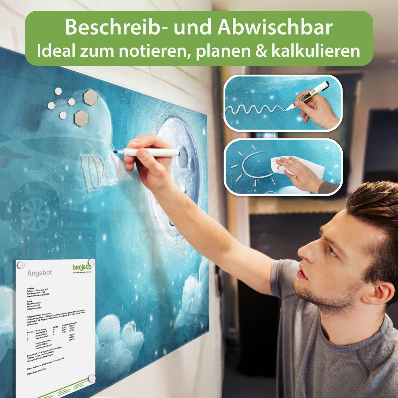 Jede Glas Magnettafel wird in unserer Werkstatt von Hand gefertigt und sorgfältig geprüft. So erhalten Sie ein echtes Qualitätsprodukt, das Funktion und Ästhetik perfekt vereint.?? Warum banjado?