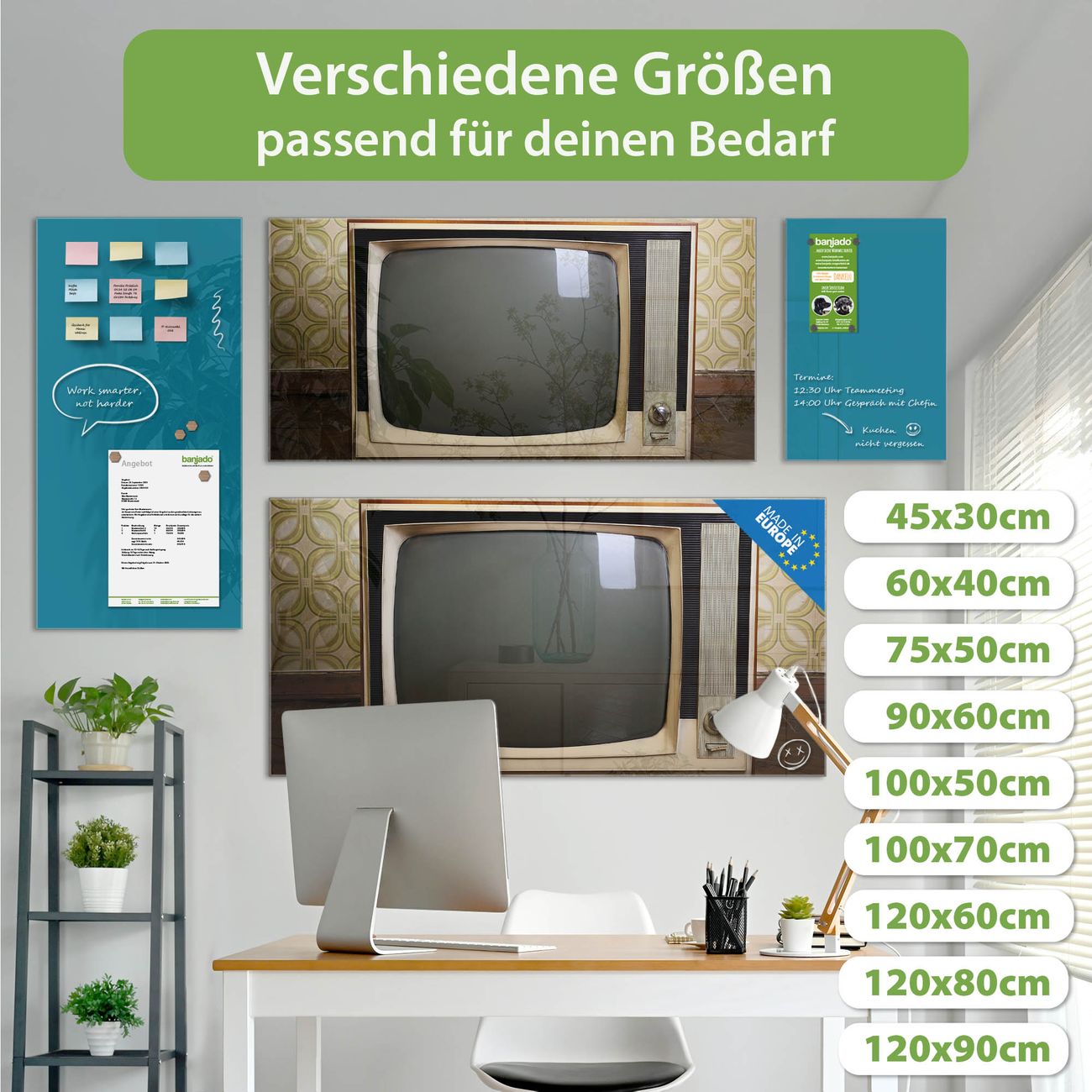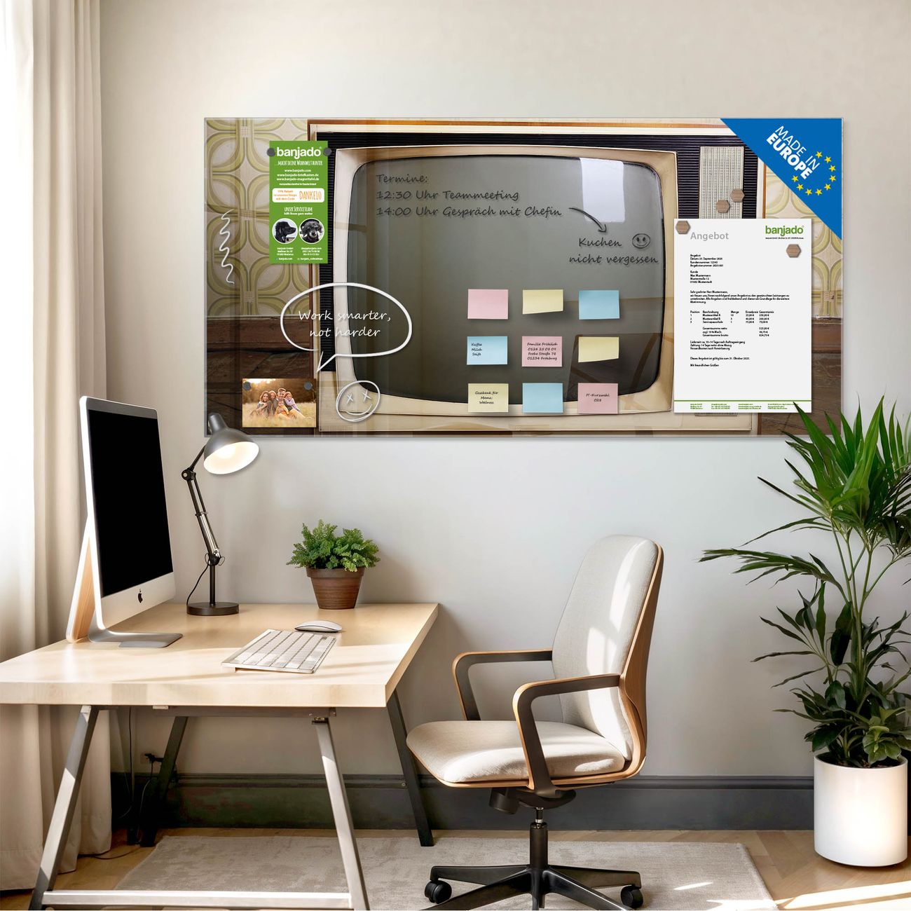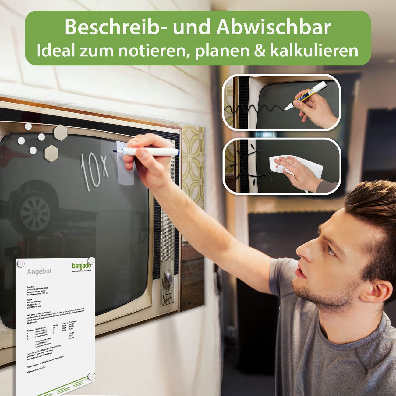 Jede Glas Magnettafel wird in unserer Werkstatt von Hand gefertigt und sorgfältig geprüft. So erhalten Sie ein echtes Qualitätsprodukt, das Funktion und Ästhetik perfekt vereint.?? Warum banjado?