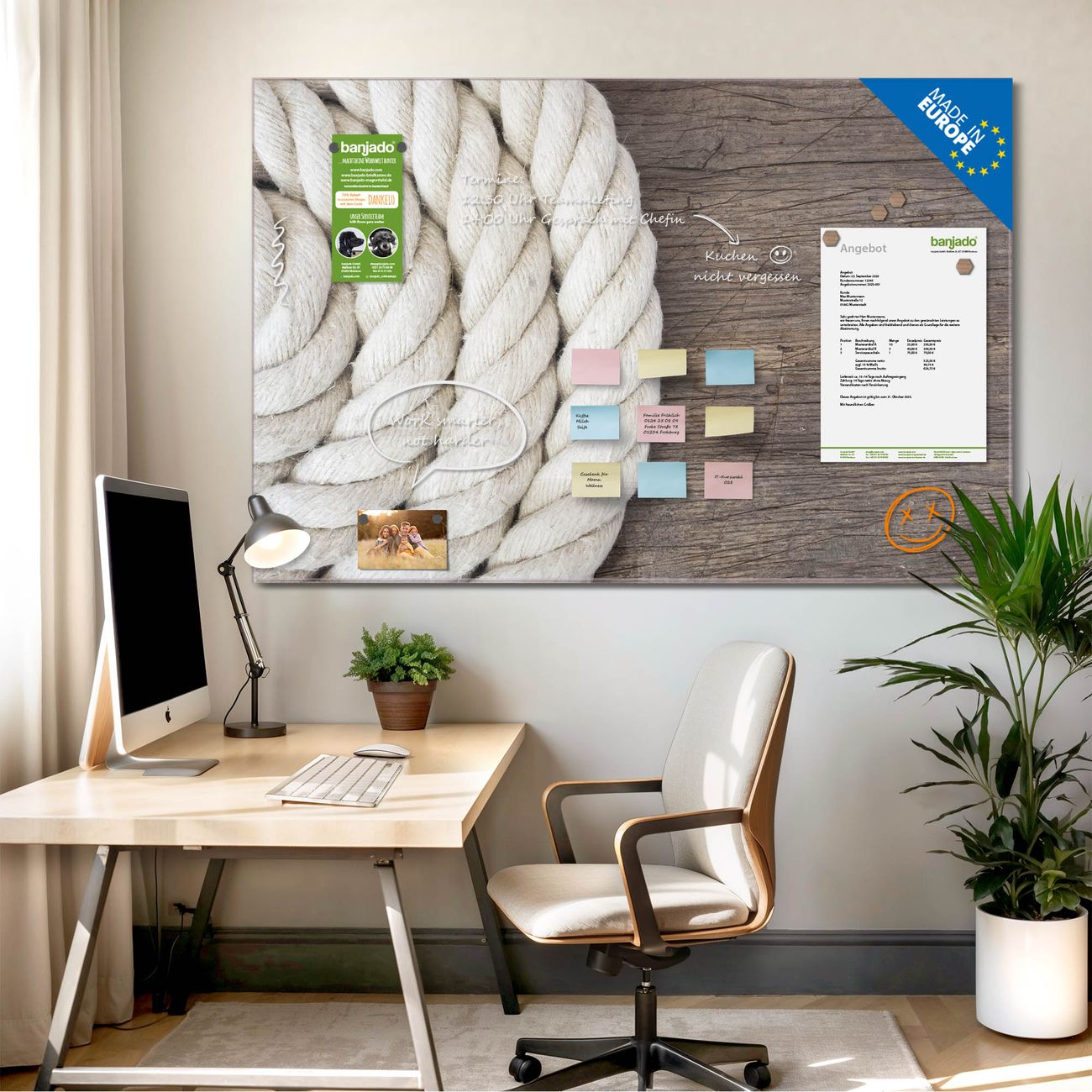 Jede Glas Magnettafel wird in unserer Werkstatt von Hand gefertigt und sorgfältig geprüft. So erhalten Sie ein echtes Qualitätsprodukt, das Funktion und Ästhetik perfekt vereint.?? Warum banjado?
