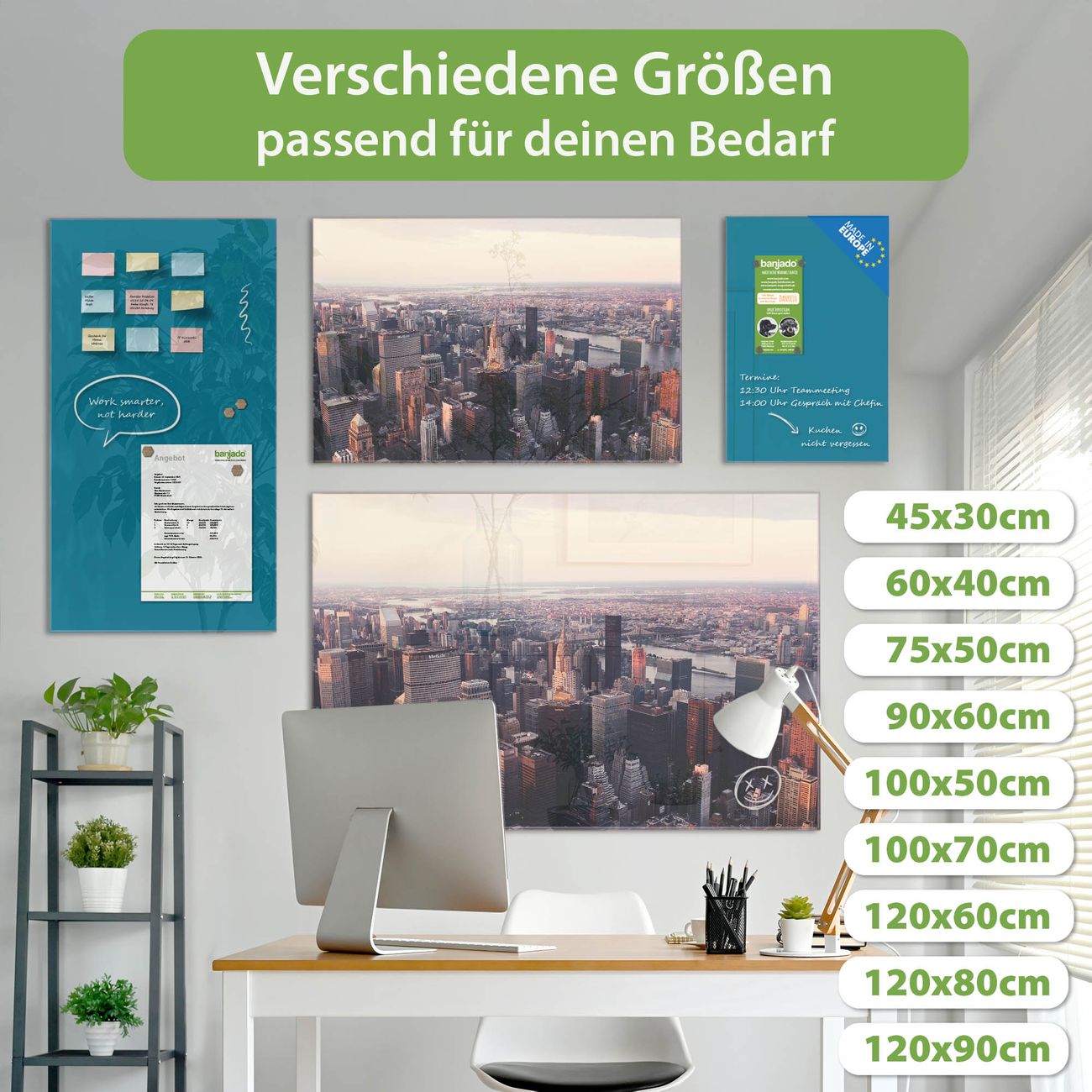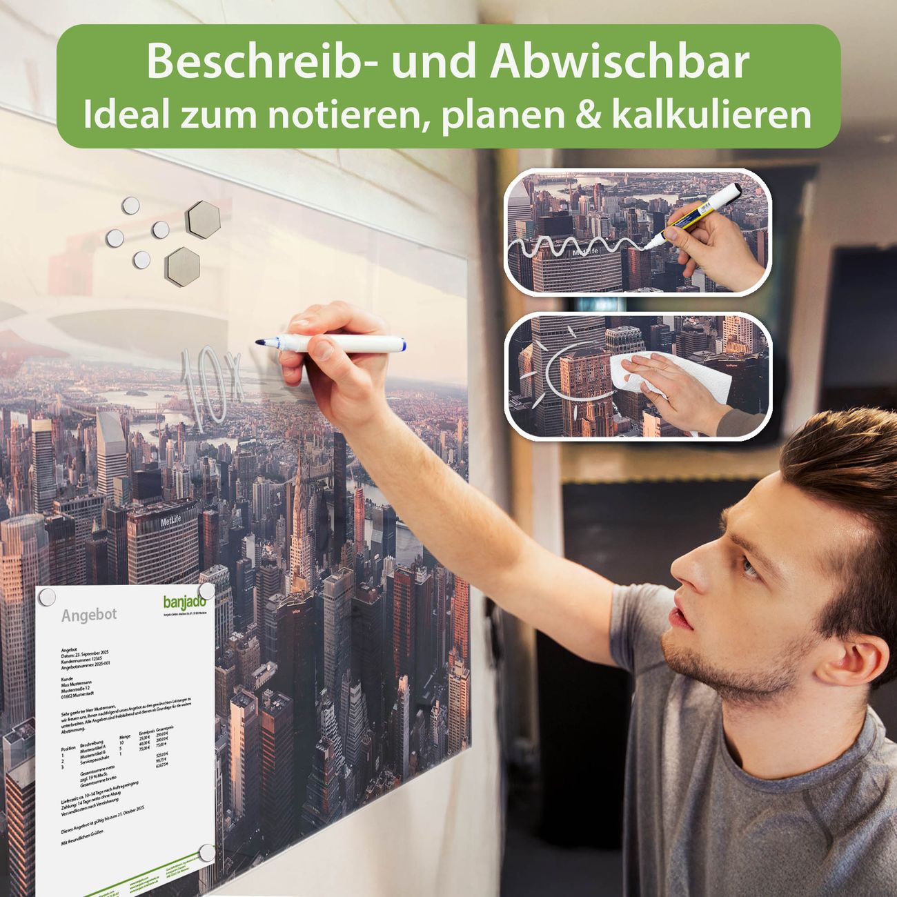 Jede Glas Magnettafel wird in unserer Werkstatt von Hand gefertigt und sorgfältig geprüft. So erhalten Sie ein echtes Qualitätsprodukt, das Funktion und Ästhetik perfekt vereint.?? Warum banjado?