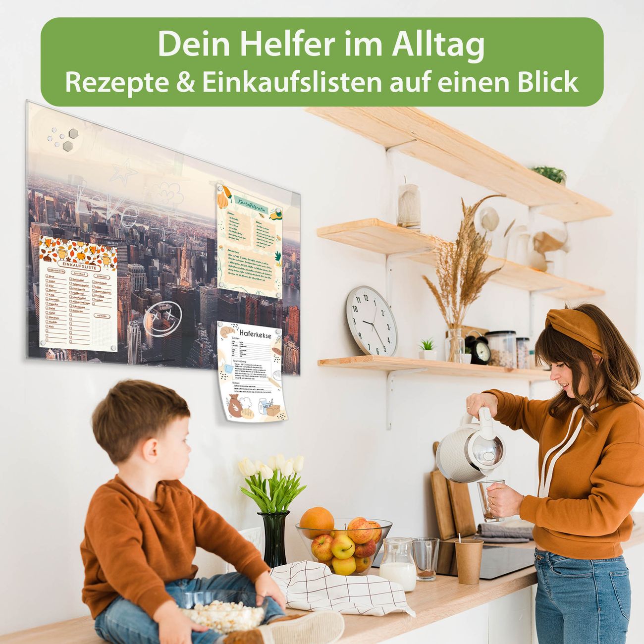Auf der glatten Glasoberfläche lassen sich Termine, Rezepte oder Notizen ganz einfach mit Kreidestiften festhalten und rückstandslos entfernen. Starke Neodym-Magnete halten Ihre wichtigsten Erinnerungen sicher an Ort und Stelle. So entsteht Ihre ganz persönliche Ideenwand - jeden Tag neu.