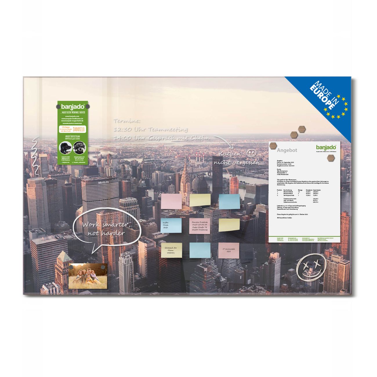 Jede Glas Magnettafel wird in unserer Werkstatt von Hand gefertigt und sorgfältig geprüft. So erhalten Sie ein echtes Qualitätsprodukt, das Funktion und Ästhetik perfekt vereint.?? Warum banjado?
