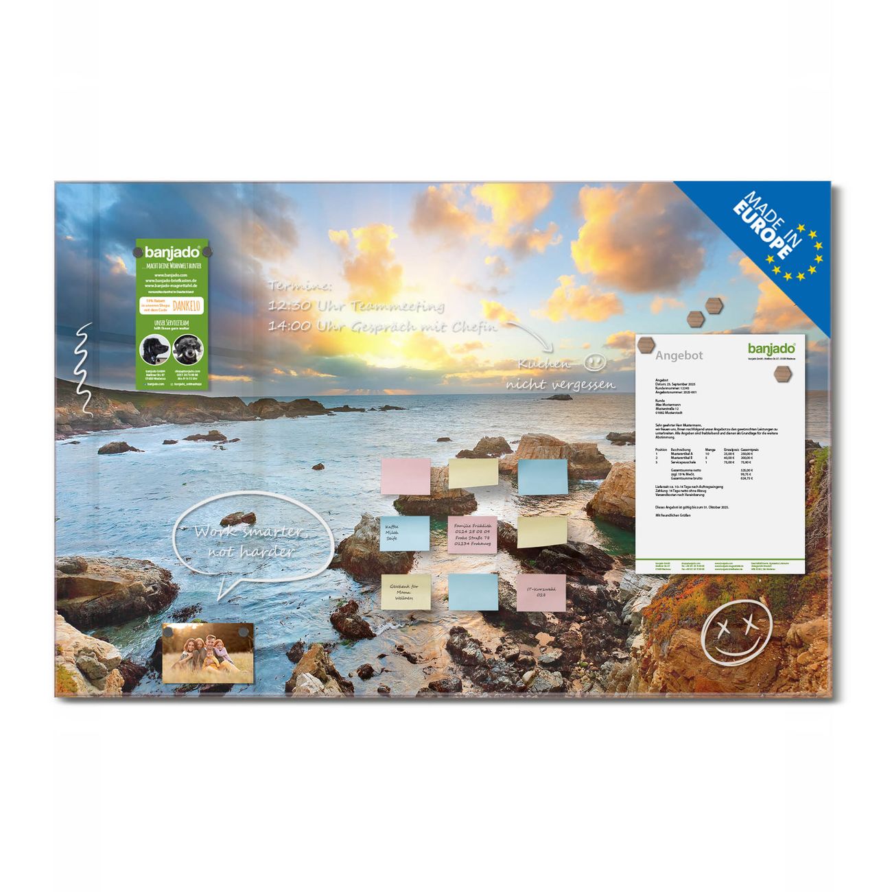 Jede Glas Magnettafel wird in unserer Werkstatt von Hand gefertigt und sorgfältig geprüft. So erhalten Sie ein echtes Qualitätsprodukt, das Funktion und Ästhetik perfekt vereint.?? Warum banjado?
