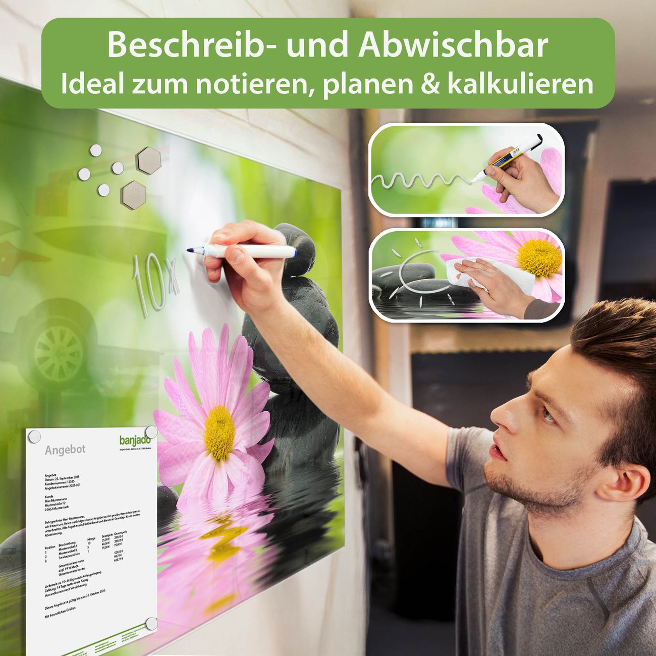 Jede Glas Magnettafel wird in unserer Werkstatt von Hand gefertigt und sorgfältig geprüft. So erhalten Sie ein echtes Qualitätsprodukt, das Funktion und Ästhetik perfekt vereint.?? Warum banjado?