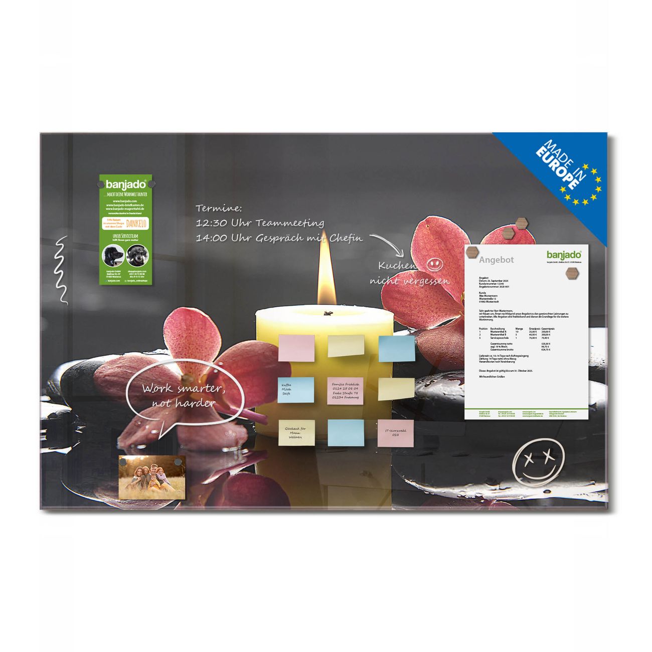 Jede Glas Magnettafel wird in unserer Werkstatt von Hand gefertigt und sorgfältig geprüft. So erhalten Sie ein echtes Qualitätsprodukt, das Funktion und Ästhetik perfekt vereint.?? Warum banjado?